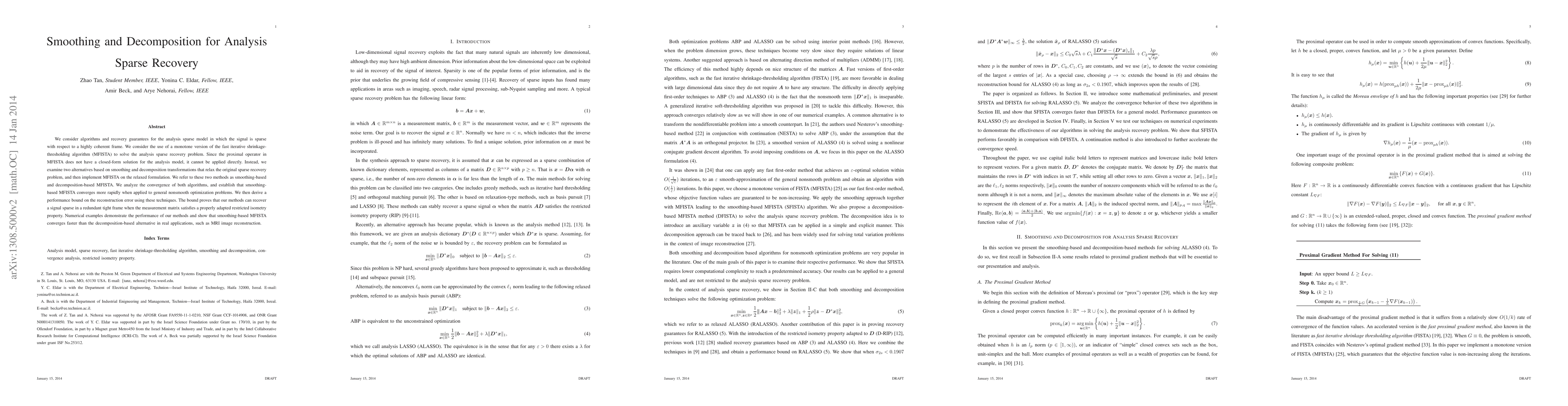 This paper proposes smoothing-based and decomposition-based versions of the monotone fast iterative shrinkage-thresholding algorithm (MFISTA) for analysis sparse recovery. The authors analyze the convergence and performance of these methods, showing that smoothing-based MFISTA converges faster and provides better reconstruction error bounds, as demonstrated through numerical examples in MRI image reconstruction.