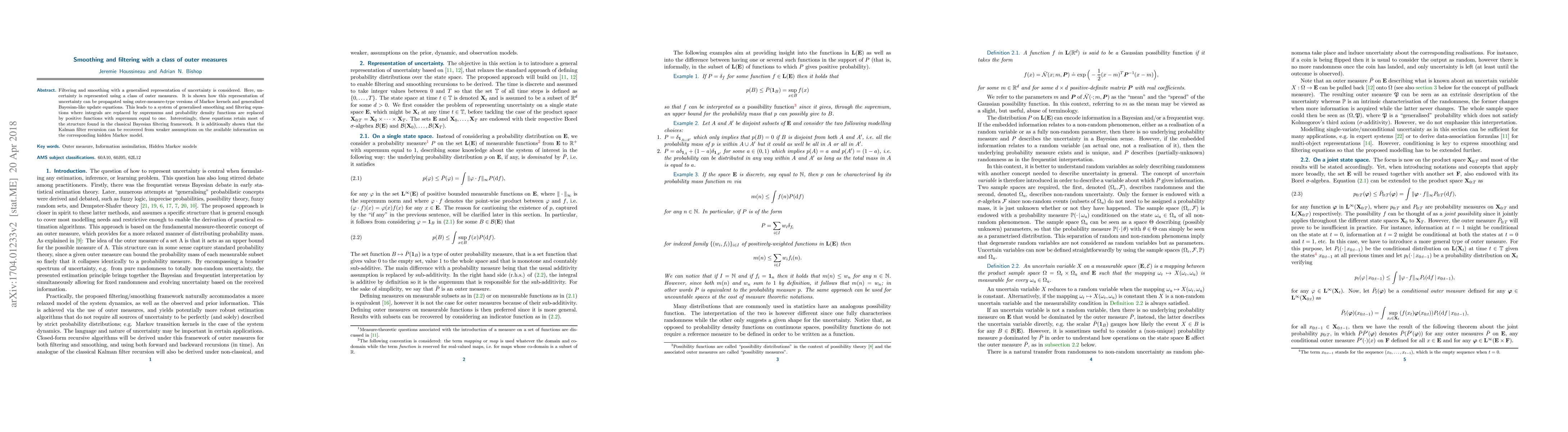 Filtering and smoothing with a generalised representation of uncertainty is considered. Here, uncertainty is represented using a class of outer measures. It is shown how this representation of uncertainty can be propagated using outer-measure-type versions of Markov kernels and generalised Bayesian-like update equations. This leads to a system of generalised smoothing and filtering equations where integrals are replaced by supremums and probability density functions are replaced by positive functions with supremum equal to one. Interestingly, these equations retain most of the structure found in the classical Bayesian filtering framework. It is additionally shown that the Kalman filter recursion can be recovered from weaker assumptions on the available information on the corresponding hidden Markov model.