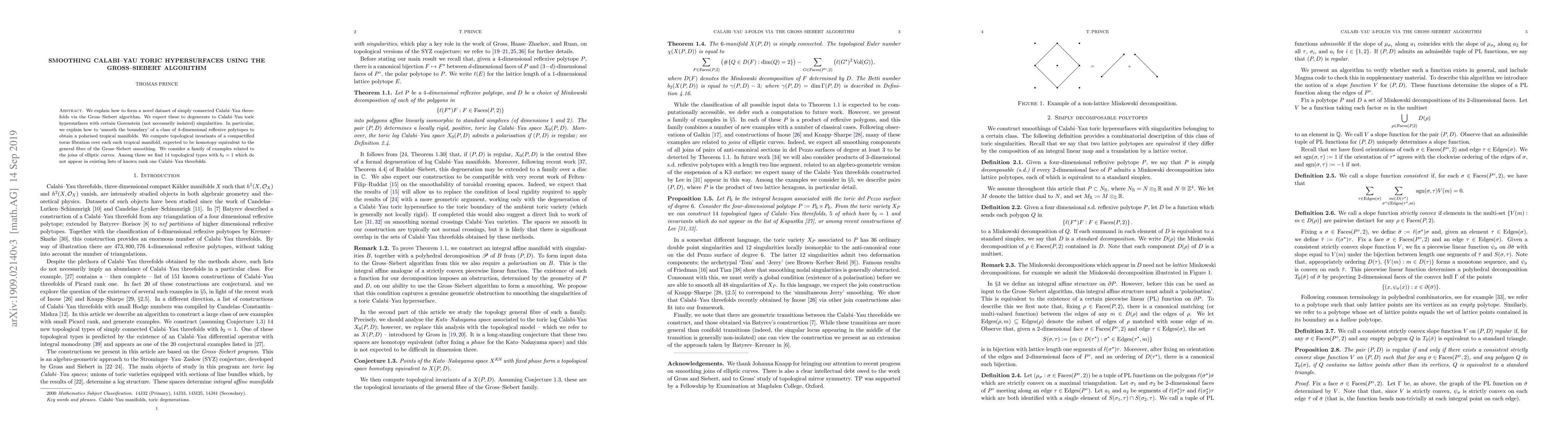 We explain how to form a novel dataset of simply connected Calabi-Yau threefolds via the Gross-Siebert algorithm. We expect these to degenerate to Calabi-Yau toric hypersurfaces with certain Gorenstein (not necessarily isolated) singularities. In particular, we explain how to `smooth the boundary' of a class of $4$-dimensional reflexive polytopes to obtain a polarised tropical manifolds. We compute topological invariants of a compactified torus fibration over each such tropical manifold, expected to be homotopy equivalent to the general fibre of the Gross-Siebert smoothing. We consider a family of examples related to the joins of elliptic curves. Among these we find $14$ topological types with $b_2=1$ which do not appear in existing lists of known rank one Calabi-Yau threefolds.