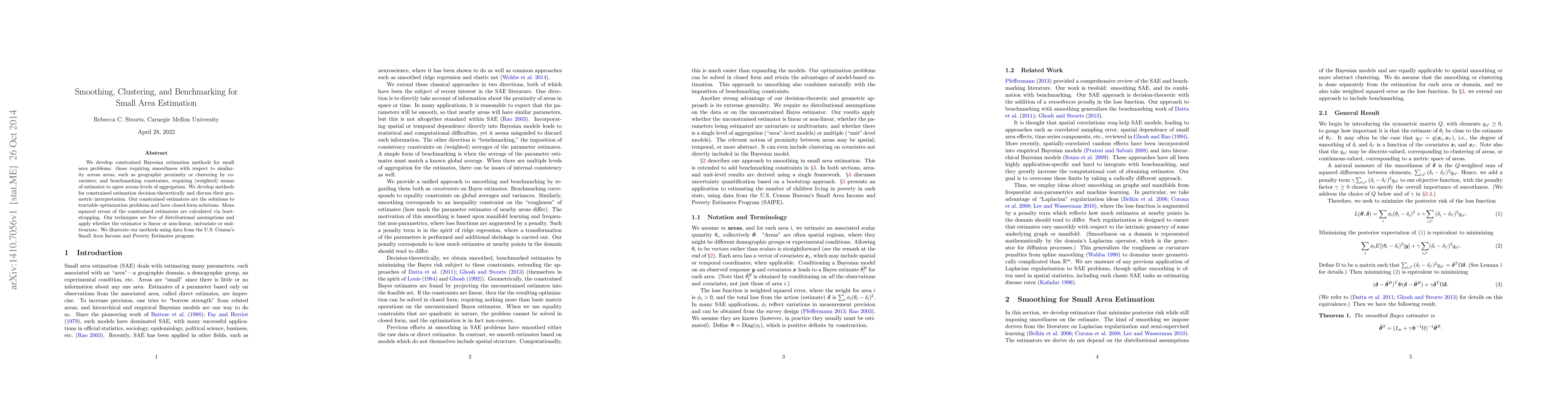 This paper develops constrained Bayesian estimation methods for small area problems, ensuring smoothness and benchmarking across areas. The proposed estimators solve tractable optimization problems and are shown to be effective through U.S. Census data analysis.