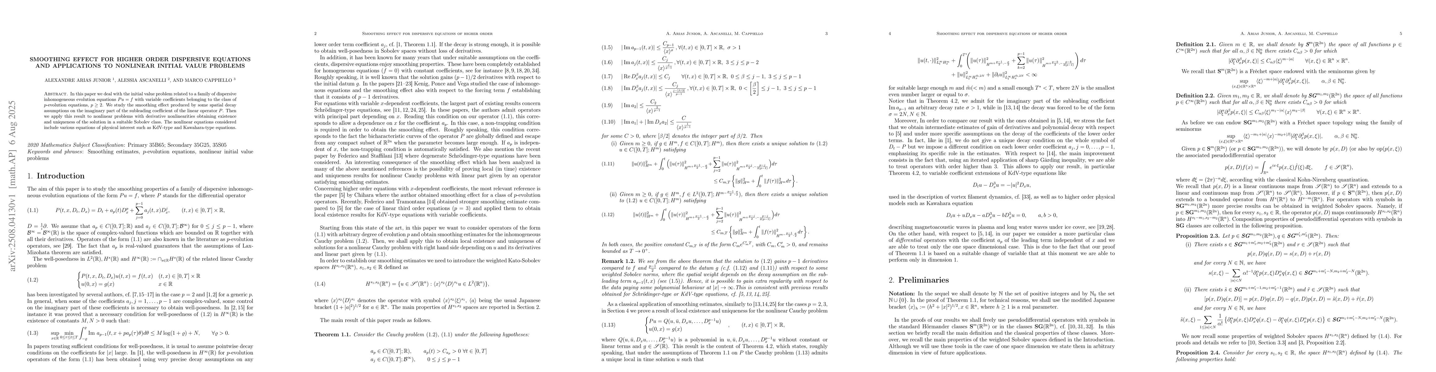 In this paper we deal with the initial value problem related to a family of dispersive inhomogeneous evolution equations Pu=f with variable coefficients belonging to the class of p-evolution equations, $p\geq 2$. We study the smoothing effect produced by some spatial decay assumptions on the imaginary part of the subleading coefficient of the linear operator P. Then we apply this result to nonlinear problems with derivative nonlinearities obtaining existence and uniqueness of the solution in a suitable Sobolev class. The nonlinear equations considered include various equations of physical interest such as KdV-type and Kawahara-type equations.