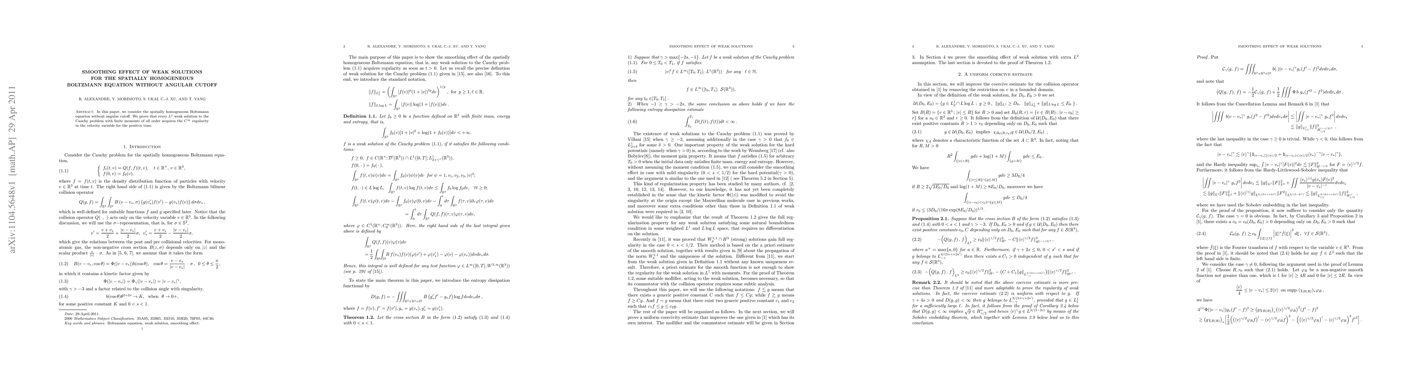 Summary: This paper proves that $L^1$ weak solutions to the spatially homogeneous Boltzmann equation without angular cutoff develop $C^\infty$ regularity in the velocity variable over time, provided they have finite moments of all orders.