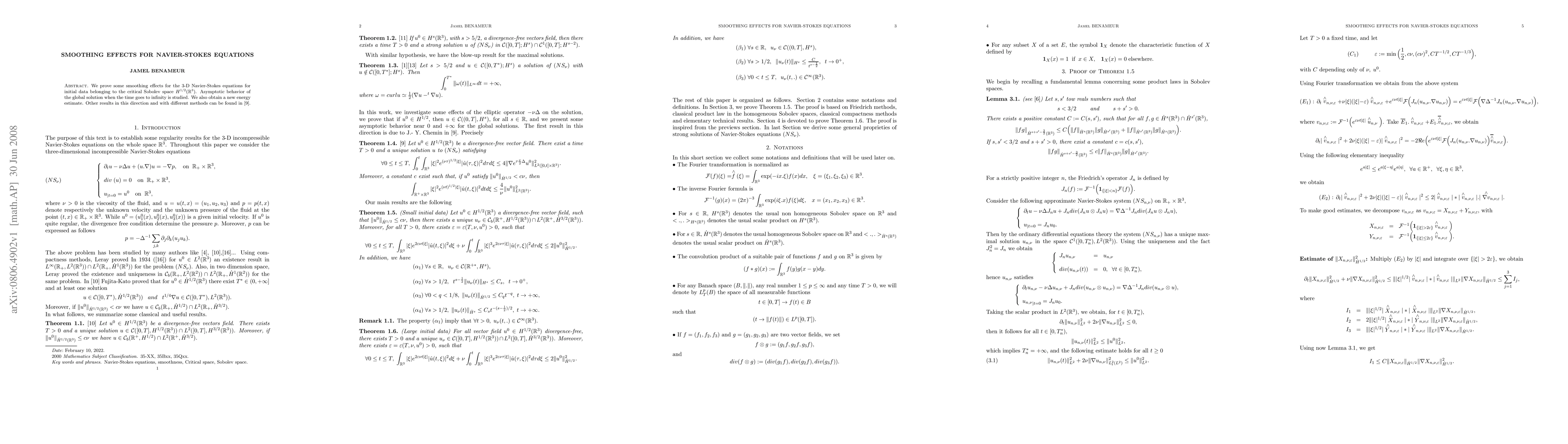 We prove some smoothing effects for the 3-D Navier-Stokes equations for initial data belonging to the critical Sobolev space $H^{1/2}(\R^3)$. Asymptotic behavior of the global solution when the time goes to infinity is studied. We also obtain a new energy estimate. Other results in this direction and with different methods can be found in \cite{C4}.