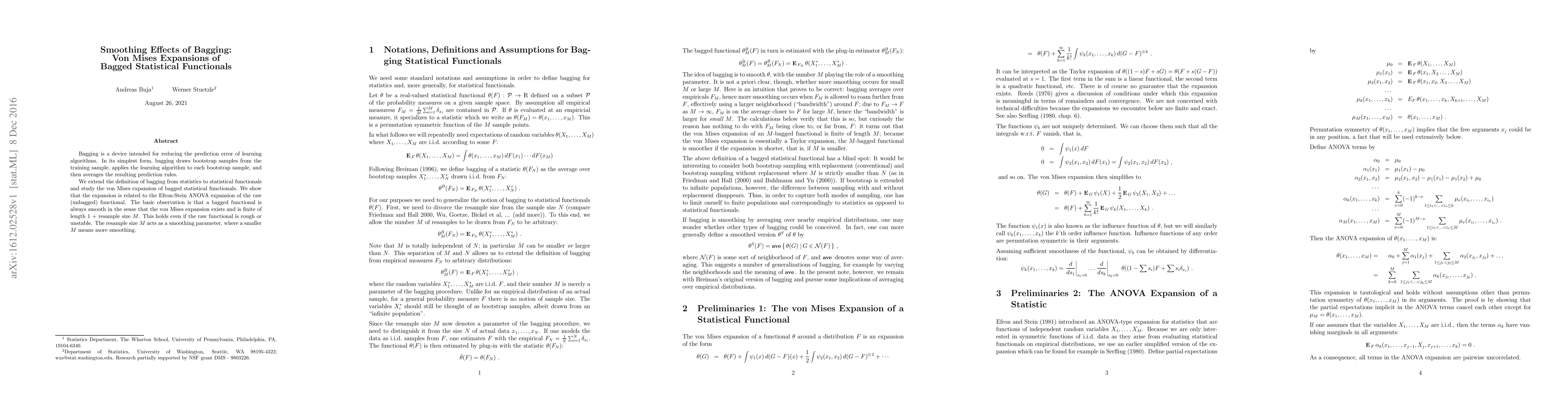 Summary: Bagging reduces prediction error by averaging predictions from bootstrap samples. This paper extends bagging to statistical functionals and uses von Mises expansions to show that bagged functionals are always smooth, with the resample size $M$ acting as a smoothing parameter.