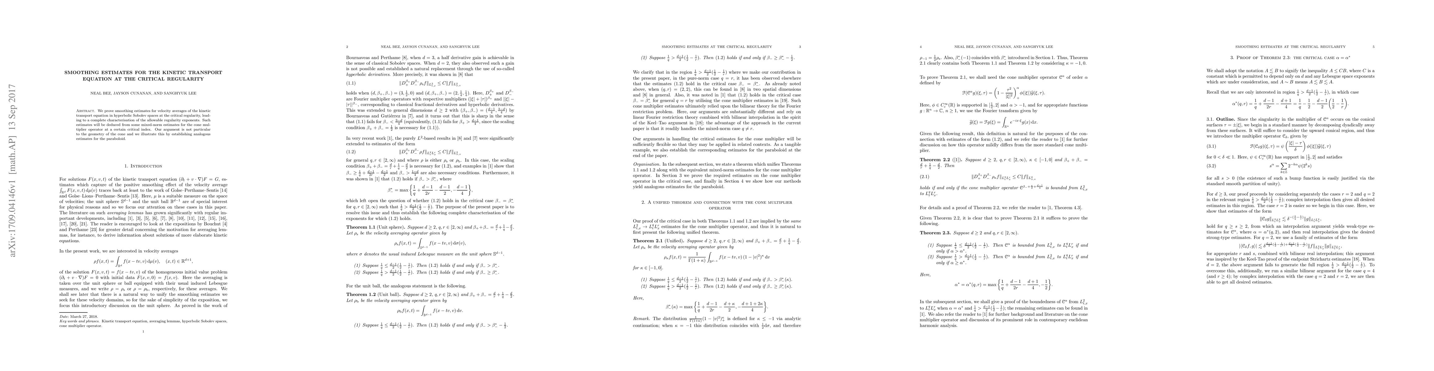 This paper proves smoothing estimates for velocity averages of the kinetic transport equation at critical regularity, utilizing mixed-norm estimates for the cone multiplier operator. The findings provide a complete characterization of allowable regularity exponents and are shown to apply to both the cone and paraboloid geometries.