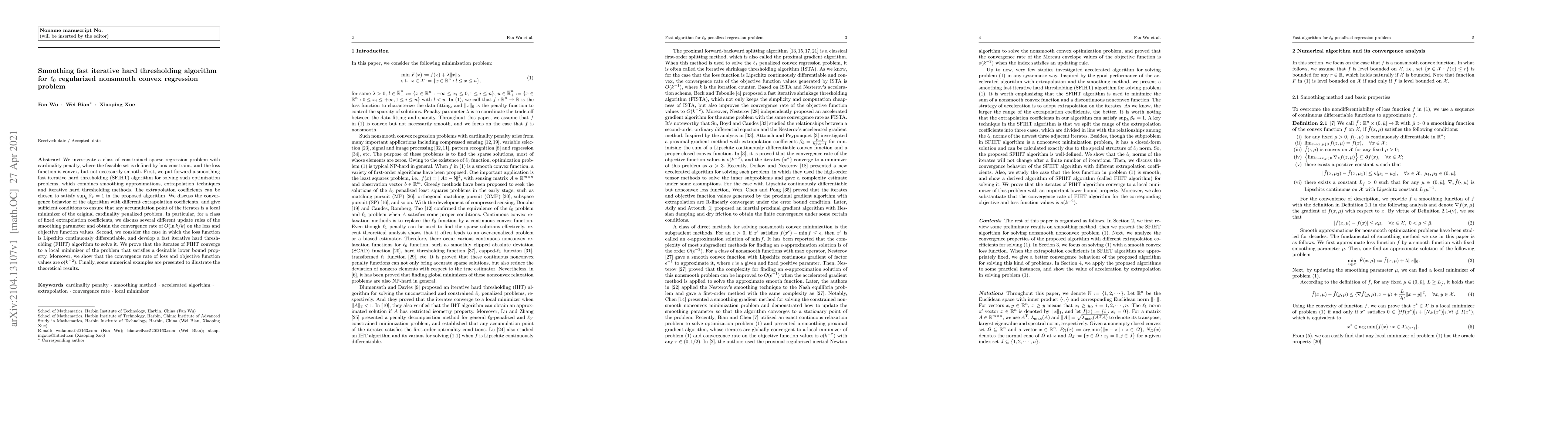 This paper proposes a Smoothing Fast Iterative Hard Thresholding (SFIHT) algorithm for solving $\ell_0$ regularized nonsmooth convex regression problems with box constraints. It also develops a Fast Iterative Hard Thresholding (FIHT) algorithm for Lipschitz continuously differentiable loss functions, proving convergence rates and local minimization properties for both methods.