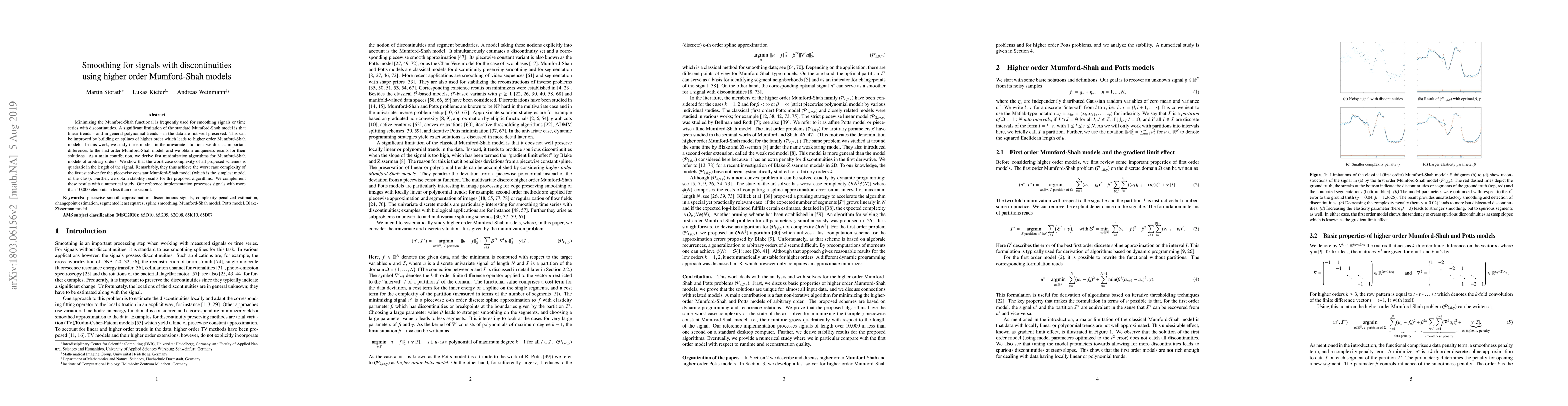 Minimizing the Mumford-Shah functional is frequently used for smoothing signals or time series with discontinuities. A significant limitation of the standard Mumford-Shah model is that linear trends -- and in general polynomial trends -- in the data are not well preserved. This can be improved by building on splines of higher order which leads to higher order Mumford-Shah models. In this work, we study these models in the univariate situation: we discuss important differences to the first order Mumford-Shah model, and we obtain uniqueness results for their solutions. As a main contribution, we derive fast minimization algorithms for Mumford-Shah models of arbitrary orders. We show that the worst case complexity of all proposed schemes is quadratic in the length of the signal. Remarkably, they thus achieve the worst case complexity of the fastest solver for the piecewise constant Mumford-Shah model (which is the simplest model of the class). Further, we obtain stability results for the proposed algorithms. We complement these results with a numerical study. Our reference implementation processes signals with more than 10,000 elements in less than one second.