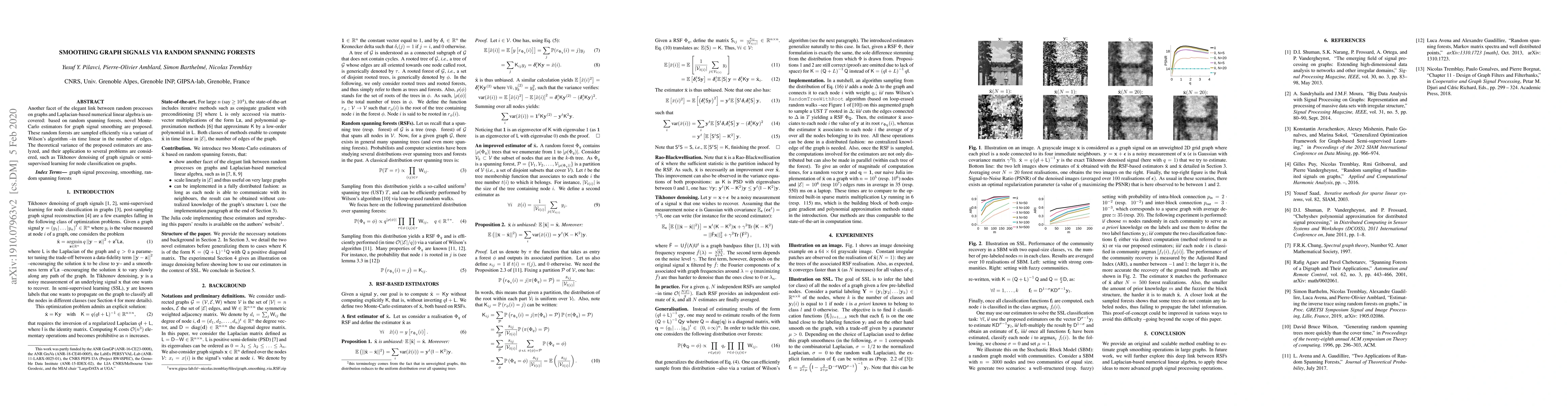 This paper proposes novel Monte-Carlo estimators for graph signal smoothing based on random spanning forests, efficiently sampled using a variant of Wilson's algorithm. The theoretical variance of these estimators is analyzed, and they are applied to problems like Tikhonov denoising and semi-supervised learning.