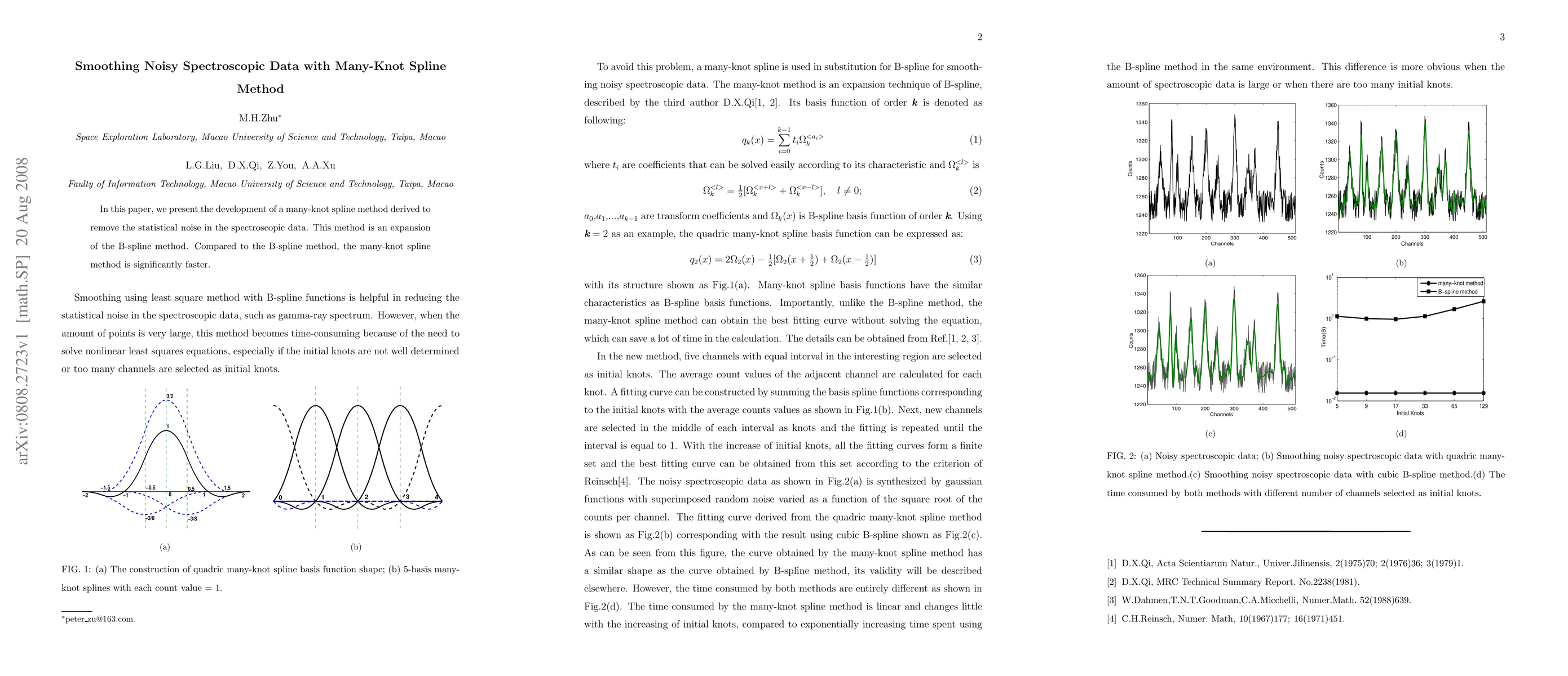 Summary: This paper introduces a many-knot spline method for efficiently smoothing noisy spectroscopic data, offering a faster alternative to the traditional B-spline method. The new approach effectively reduces statistical noise while maintaining computational efficiency.