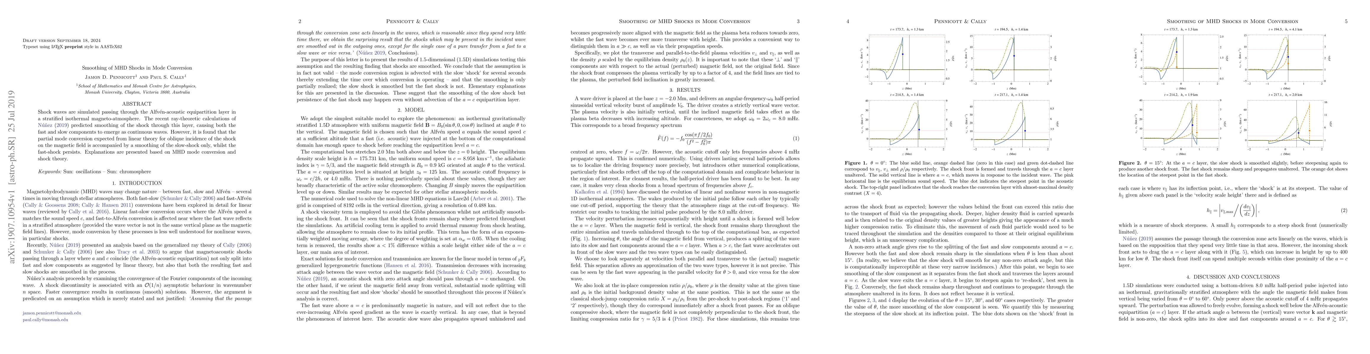 This study simulates shock waves traversing the Alfvén-acoustic equipartition layer in a stratified magneto-atmosphere, revealing that while the shock smooths out, only the slow-shock undergoes this effect, contrary to predictions of complete smoothing for both fast and slow shocks. The findings are explained through magnetohydrodynamic (MHD) mode conversion and shock theory.