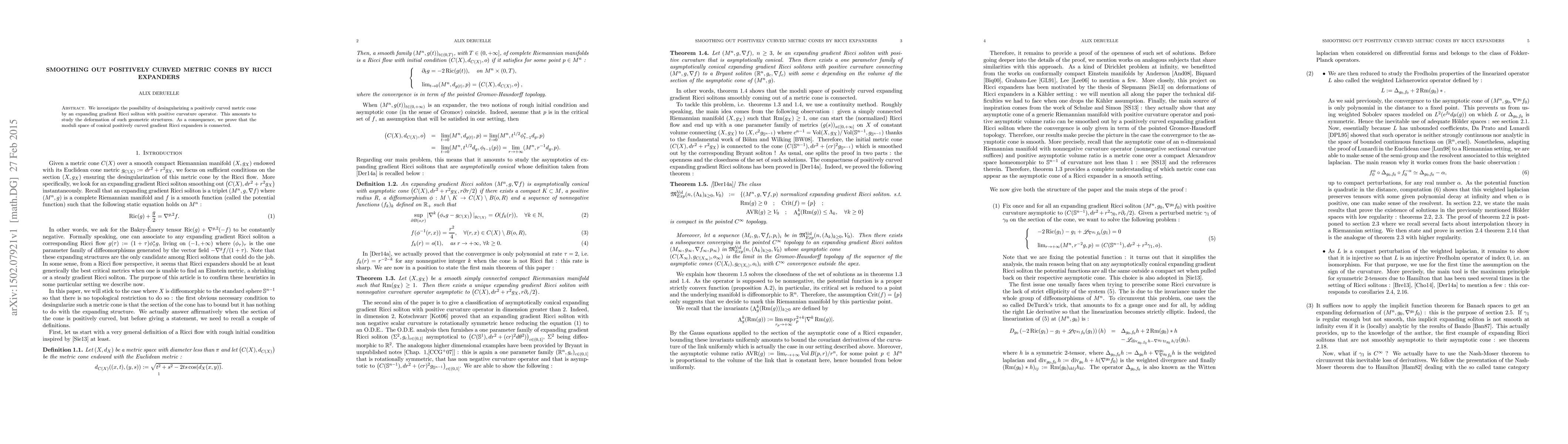 We investigate the possibility of desingularizing a positively curved metric cone by an expanding gradient Ricci soliton with positive curvature operator. This amounts to study the deformation of such geometric structures. As a consequence, we prove that the moduli space of conical positively curved gradient Ricci expanders is connected.