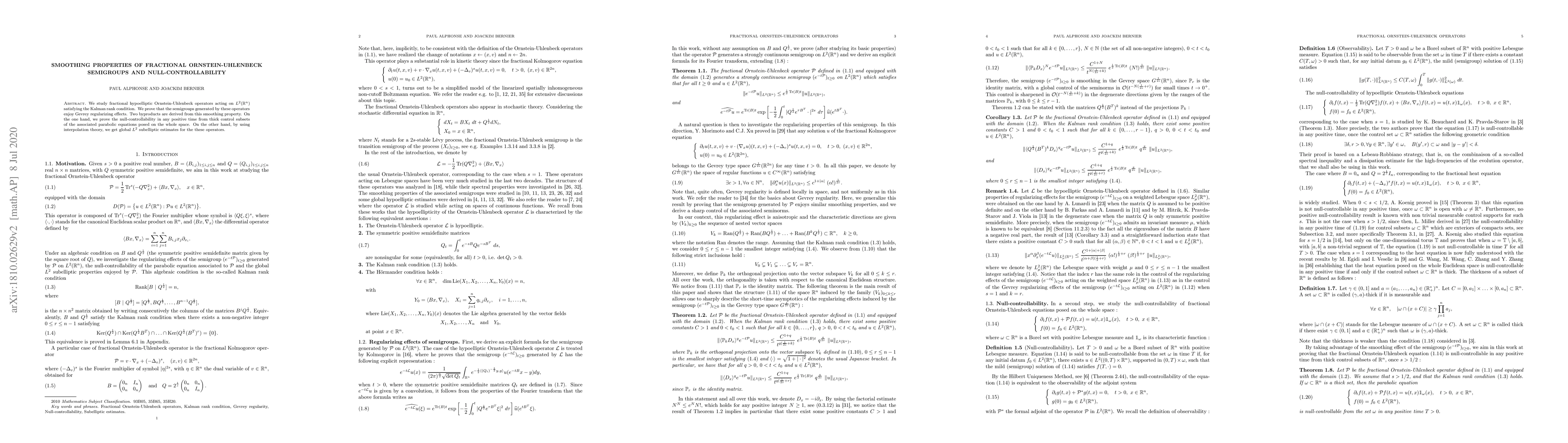We study fractional hypoelliptic Ornstein-Uhlenbeck operators acting on $L^2(\mathbb{R}^n)$ satisfying the Kalman rank condition. We prove that the semigroups generated by these operators enjoy Gevrey regularizing effects. Two byproducts are derived from this smoothing property. On the one hand, we prove the null-controllability in any positive time from thick control subsets of the associated parabolic equations posed on the whole space. On the other hand, by using interpolation theory, we get global $L^2$ subelliptic estimates for the these operators.