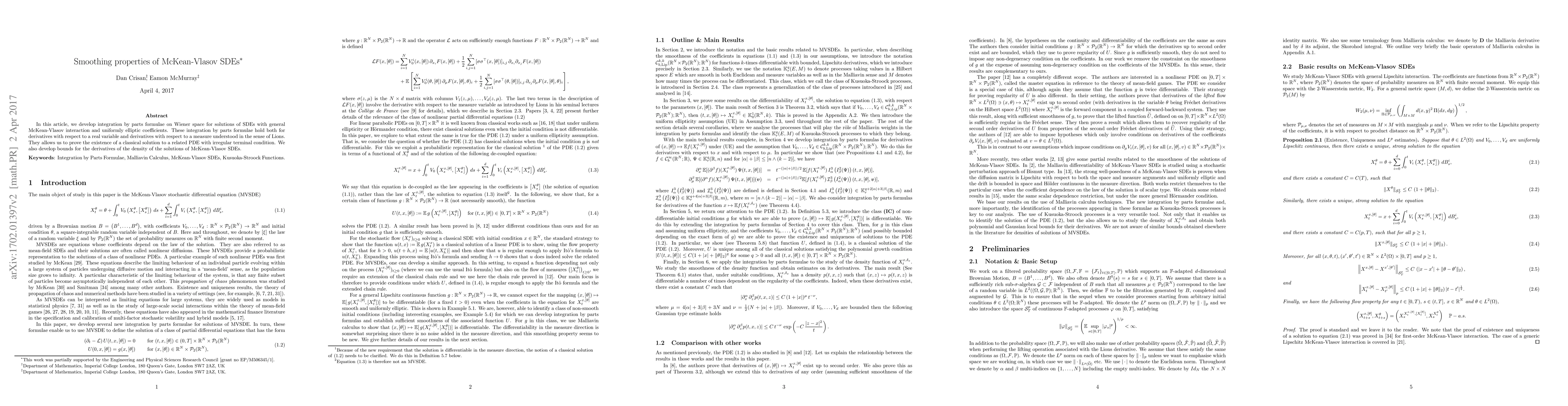 This paper establishes integration by parts formulae for McKean-Vlasov stochastic differential equations (SDEs) with uniformly elliptic coefficients, proving the existence of classical solutions to related PDEs and deriving bounds for the density derivatives of the solutions.