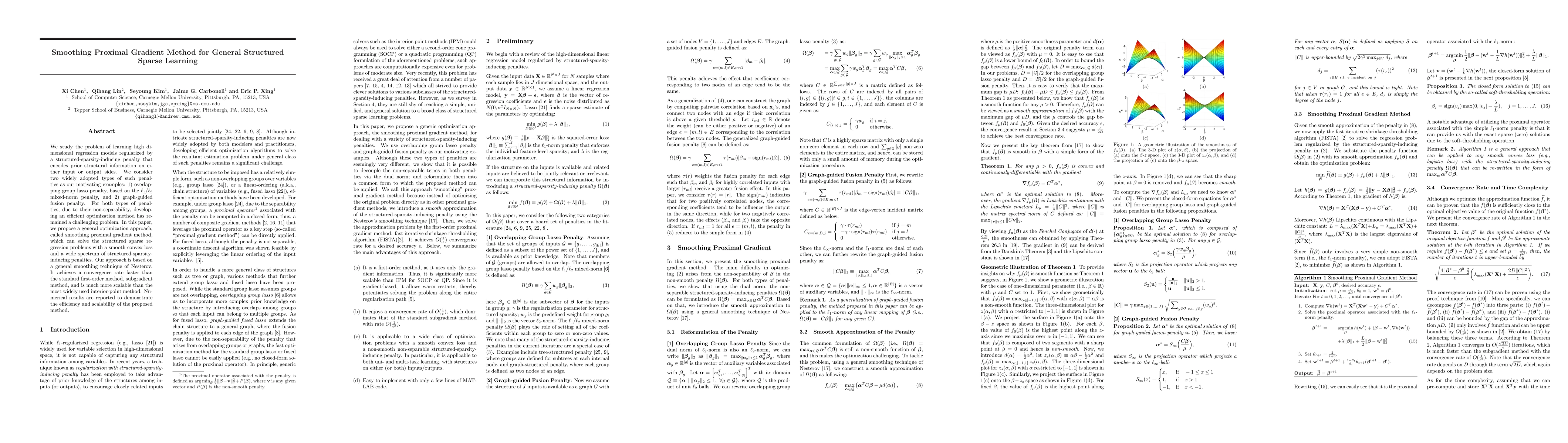We study the problem of learning high dimensional regression models regularized by a structured-sparsity-inducing penalty that encodes prior structural information on either input or output sides. We consider two widely adopted types of such penalties as our motivating examples: 1) overlapping group lasso penalty, based on the l1/l2 mixed-norm penalty, and 2) graph-guided fusion penalty. For both types of penalties, due to their non-separability, developing an efficient optimization method has remained a challenging problem. In this paper, we propose a general optimization approach, called smoothing proximal gradient method, which can solve the structured sparse regression problems with a smooth convex loss and a wide spectrum of structured-sparsity-inducing penalties. Our approach is based on a general smoothing technique of Nesterov. It achieves a convergence rate faster than the standard first-order method, subgradient method, and is much more scalable than the most widely used interior-point method. Numerical results are reported to demonstrate the efficiency and scalability of the proposed method.