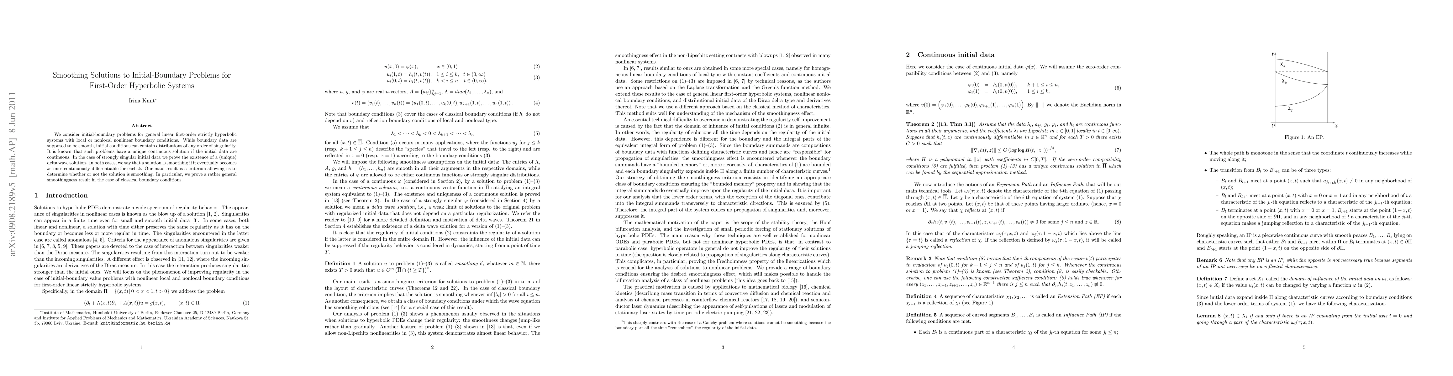 This paper investigates initial-boundary problems for first-order hyperbolic systems with nonlinear boundary conditions. The authors prove the existence of a unique delta wave solution for strongly singular initial data and establish a criterion to determine if solutions become $k$-times continuously differentiable over time, termed smoothing solutions.