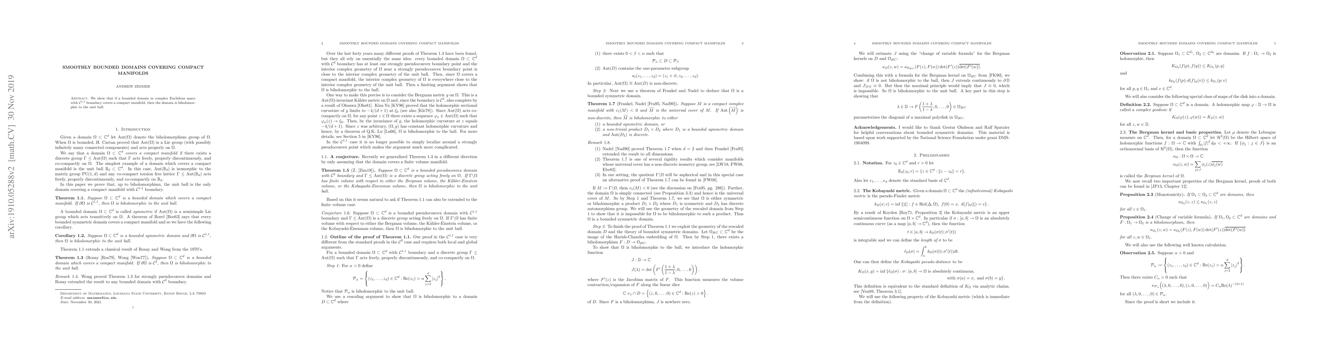 We show that if a bounded domain in complex Euclidean space with $\mathcal{C}^{1,1}$ boundary covers a compact manifold, then the domain is biholomorphic to the unit ball.