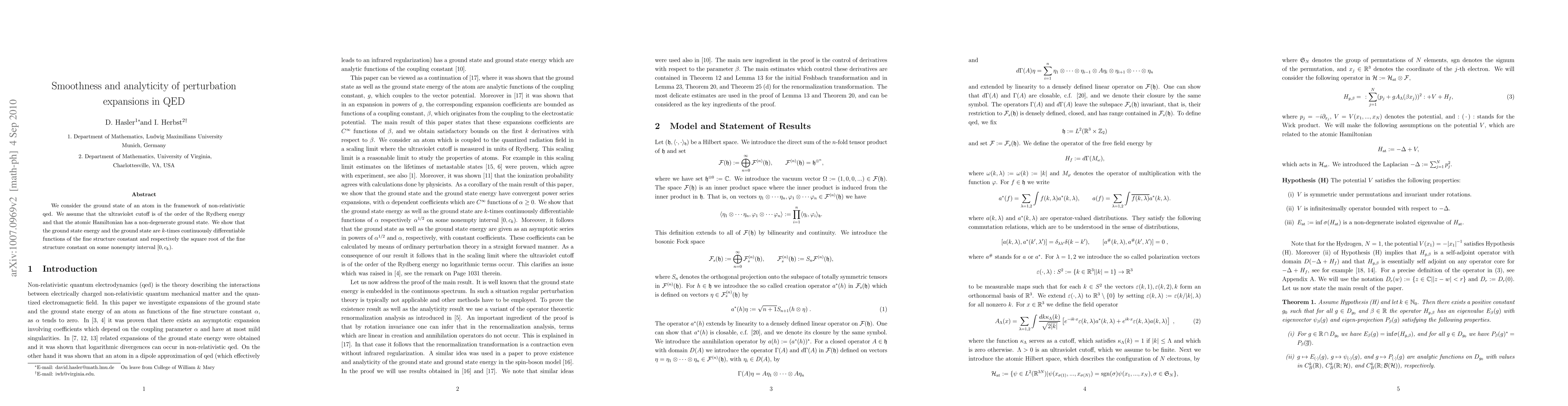 We consider the ground state of an atom in the framework of non-relativistic qed. We assume that the ultraviolet cutoff is of the order of the Rydberg energy and that the atomic Hamiltonian has a non-degenerate ground state. We show that the ground state energy and the ground state are k-times continuously differentiable functions of the fine structure constant and respectively the square root of the fine structure constant on some nonempty interval [0,c_k).