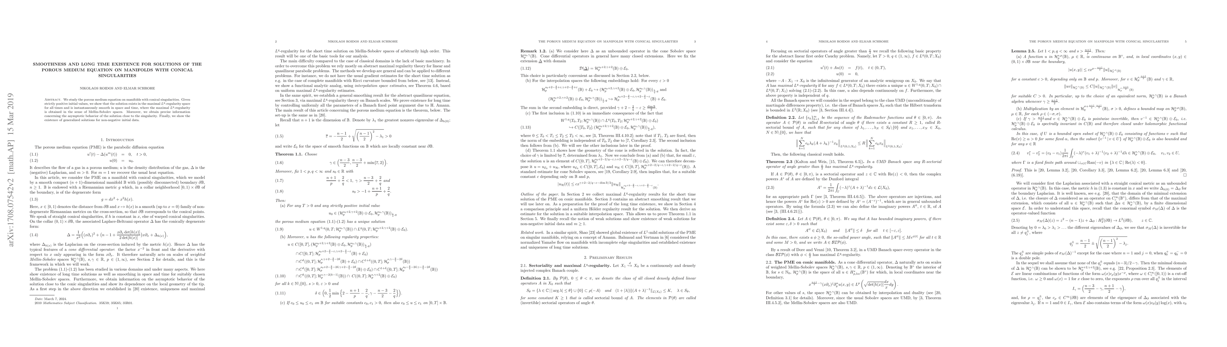 This paper investigates the porous medium equation on manifolds with conical singularities, proving the existence and smoothness of solutions in maximal $L^{q}$-regularity space for all times, and providing insights into the asymptotic behavior near singularities. It also establishes generalized solutions for non-negative initial data.