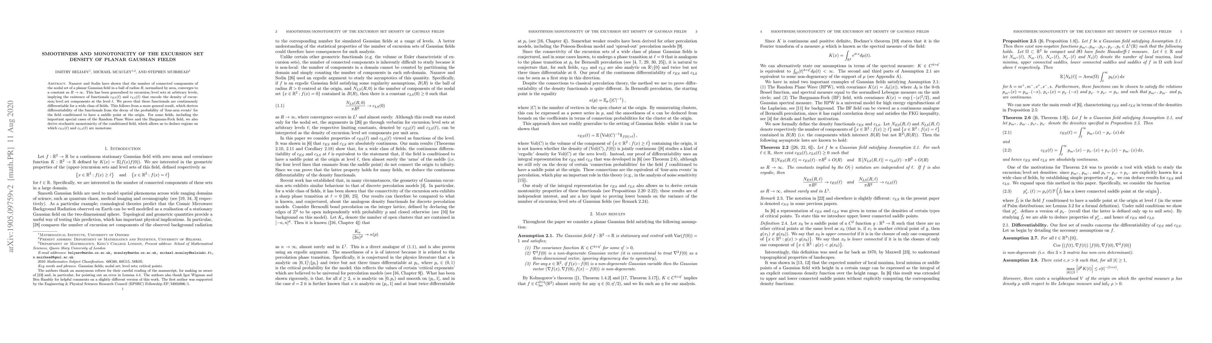 This paper proves the smoothness and monotonicity of functionals encoding the density of excursion/level set components in planar Gaussian fields. It demonstrates differentiability of these functionals through the decay of specific probability events and identifies regions where the functionals are monotone for certain fields.