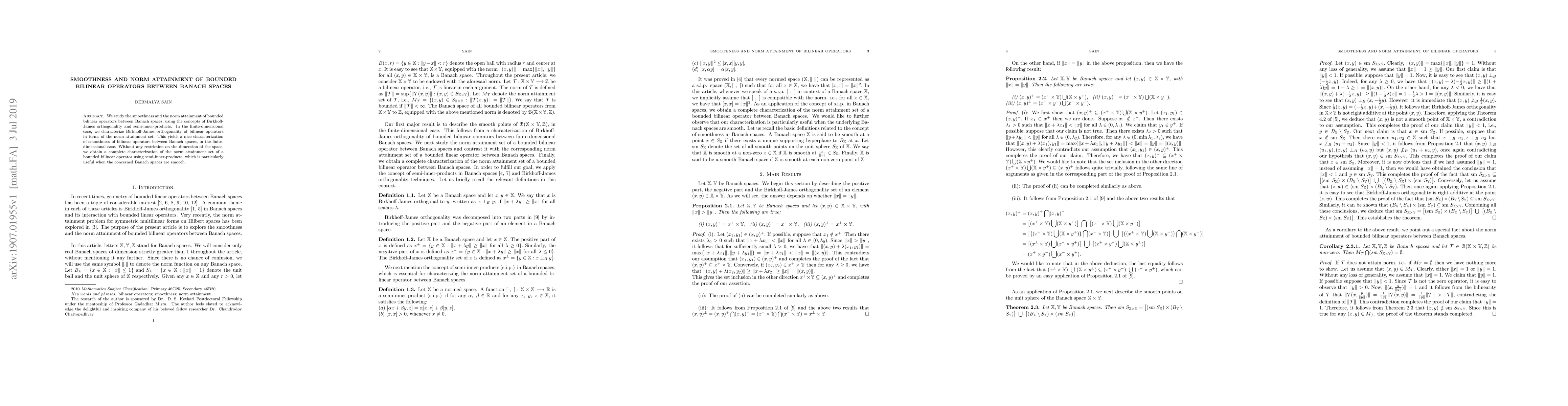 This paper investigates the smoothness and norm attainment of bounded bilinear operators between Banach spaces, employing Birkhoff-James orthogonality and semi-inner-products. It provides a finite-dimensional characterization of Birkhoff-James orthogonality in terms of the norm attainment set and a comprehensive description of the norm attainment set using semi-inner-products, especially for smooth Banach spaces.