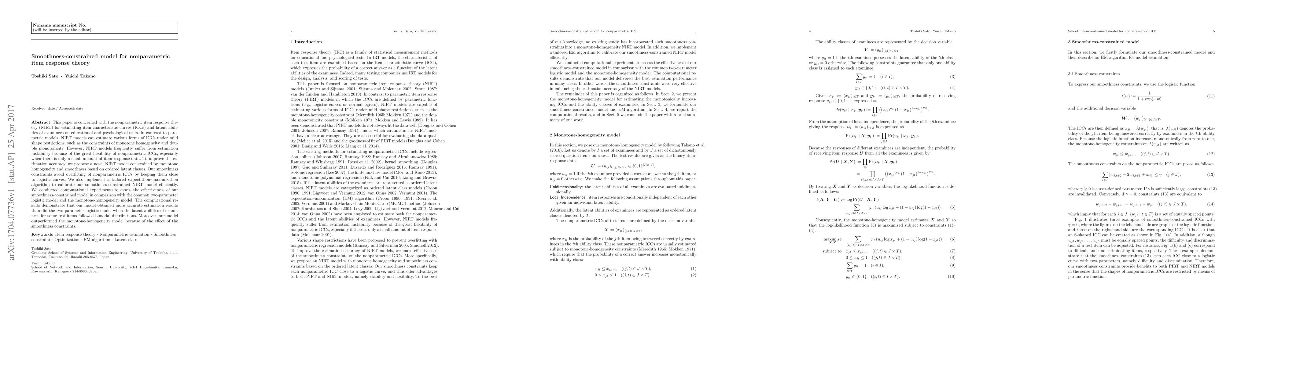 This paper proposes a smoothness-constrained nonparametric item response theory (NIRT) model to improve the estimation accuracy of item characteristic curves and latent abilities under mild shape restrictions. The model incorporates smoothness constraints to avoid overfitting and employs an expectation-maximization algorithm for efficient calibration, demonstrating superior performance compared to traditional parametric and monotone-homogeneity models, especially in scenarios with bimodal latent abilities.