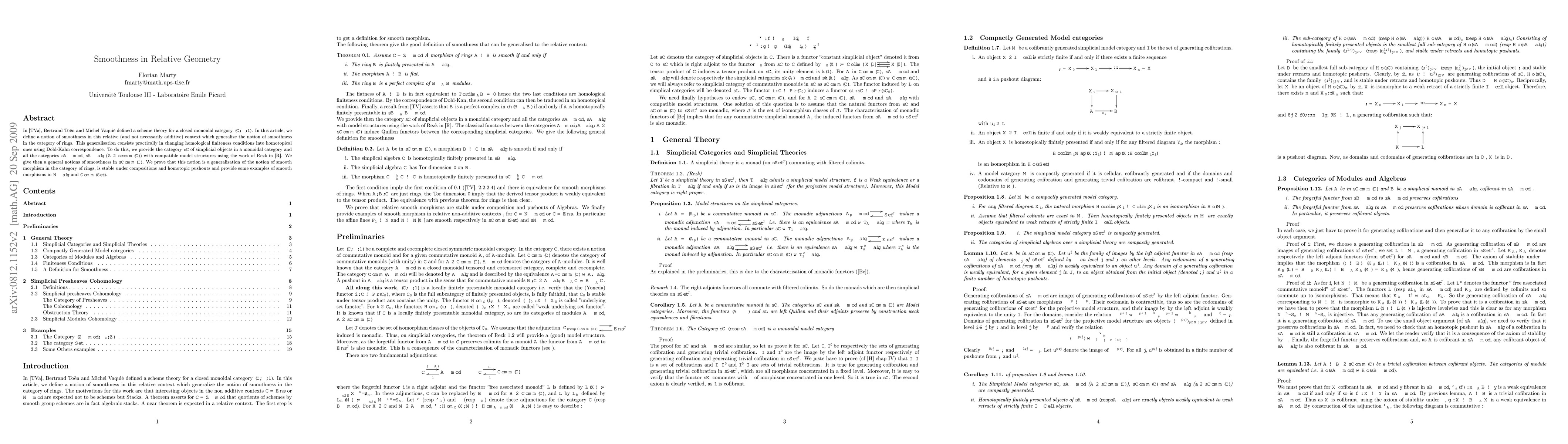 This paper introduces a generalized notion of smoothness in relative geometry, extending the concept from ring theory to closed monoidal categories. It achieves this by transforming homological finiteness conditions into homotopical ones using the Dold-Kahn correspondence and simplicial objects. The authors provide model structures for categories of simplicial objects and algebras, demonstrating that their definition of smoothness in sComm(C) encompasses smooth morphisms in the category of rings, with examples in N-alg, Comm(Set), and Comm(C).