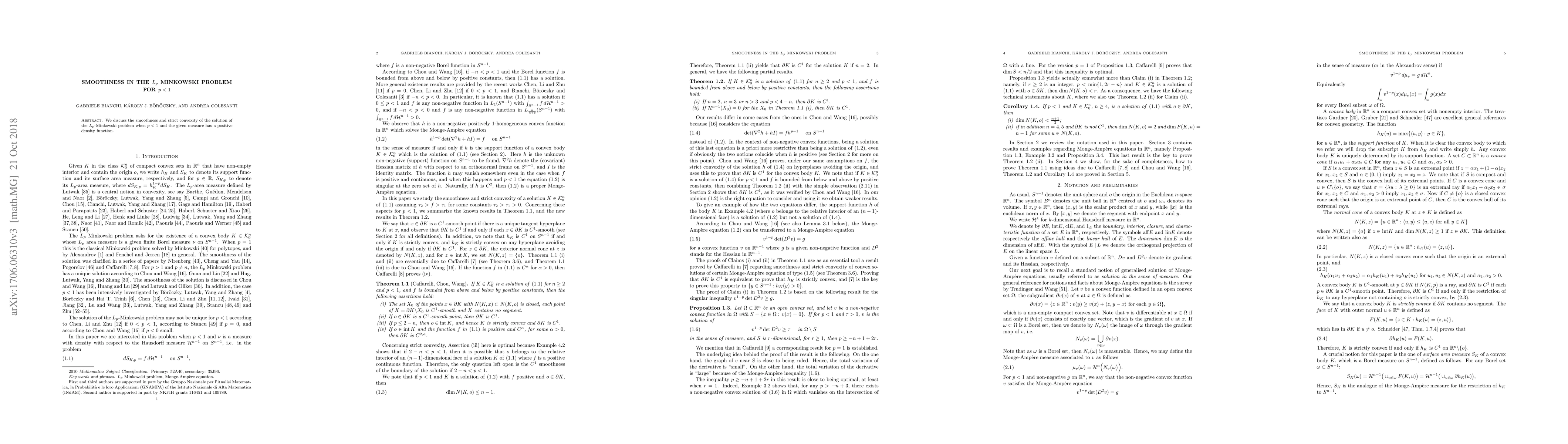 We discuss the smoothness and strict convexity of the solution of the $L_p$ Minkowski problem when $p<1$ and the given measure has a positive density function.