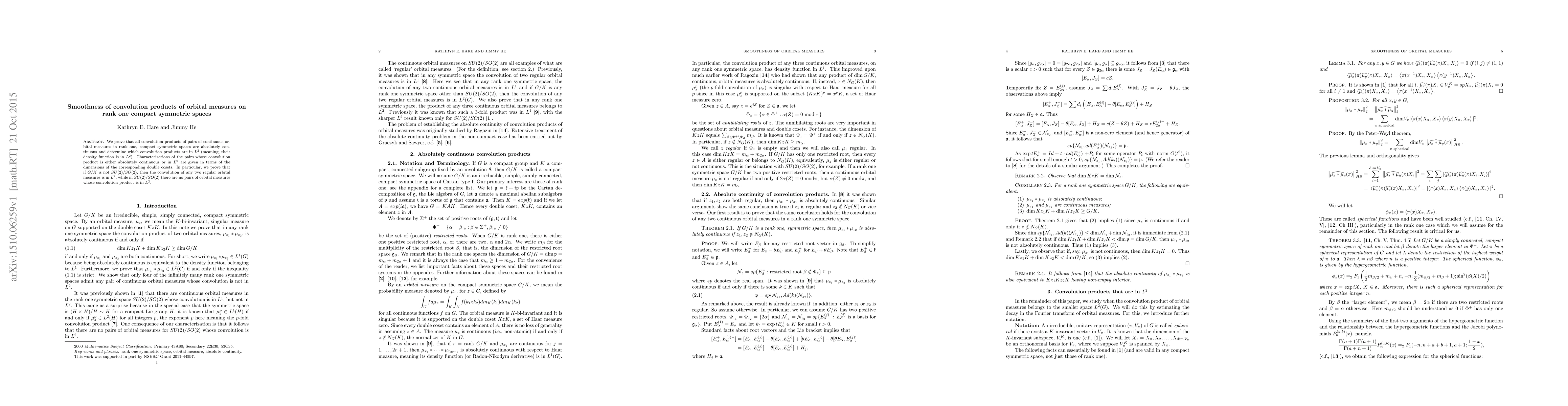This paper proves that convolution products of continuous orbital measures in rank one compact symmetric spaces are absolutely continuous and identifies which are in $L^{2}$. It characterizes pairs whose convolution products meet these criteria based on the dimensions of corresponding double cosets, showing that $L^{2}$ membership varies depending on the specific space, notably excluding $SU(2)/SO(2)$ from having such convolution products.