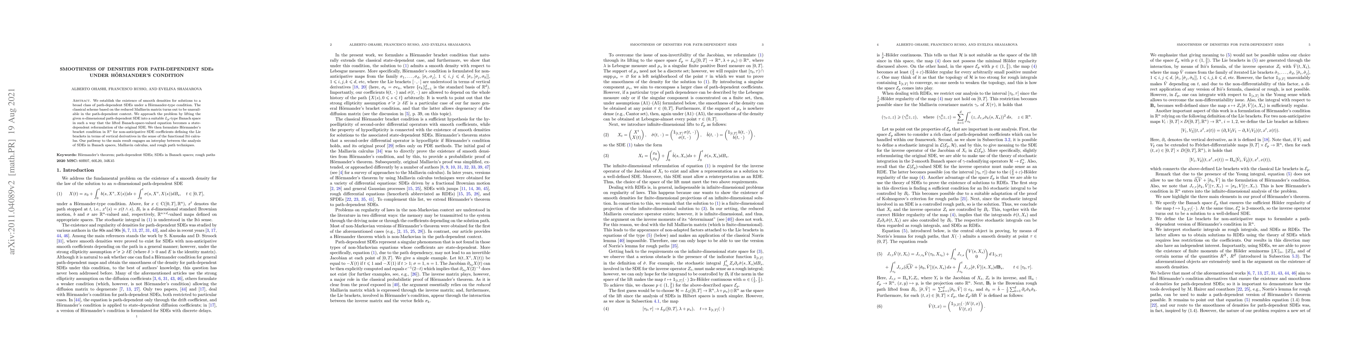 We establish the existence of smooth densities for solutions to a broad class of path-dependent SDEs under a H\"ormander-type condition. The classical scheme based on the reduced Malliavin matrix turns out to be unavailable in the path-dependent context. We approach the problem by lifting the given $n$-dimensional path-dependent SDE into a suitable $L_p$-type Banach space in such a way that the lifted Banach-space-valued equation becomes a state-dependent reformulation of the original SDE. We then formulate H\"ormander's bracket condition in $\mathbb R^n$ for non-anticipative SDE coefficients defining the Lie brackets in terms of vertical derivatives in the sense of the functional It\^o calculus. Our pathway to the main result engages an interplay between the analysis of SDEs in Banach spaces, Malliavin calculus, and rough path techniques.