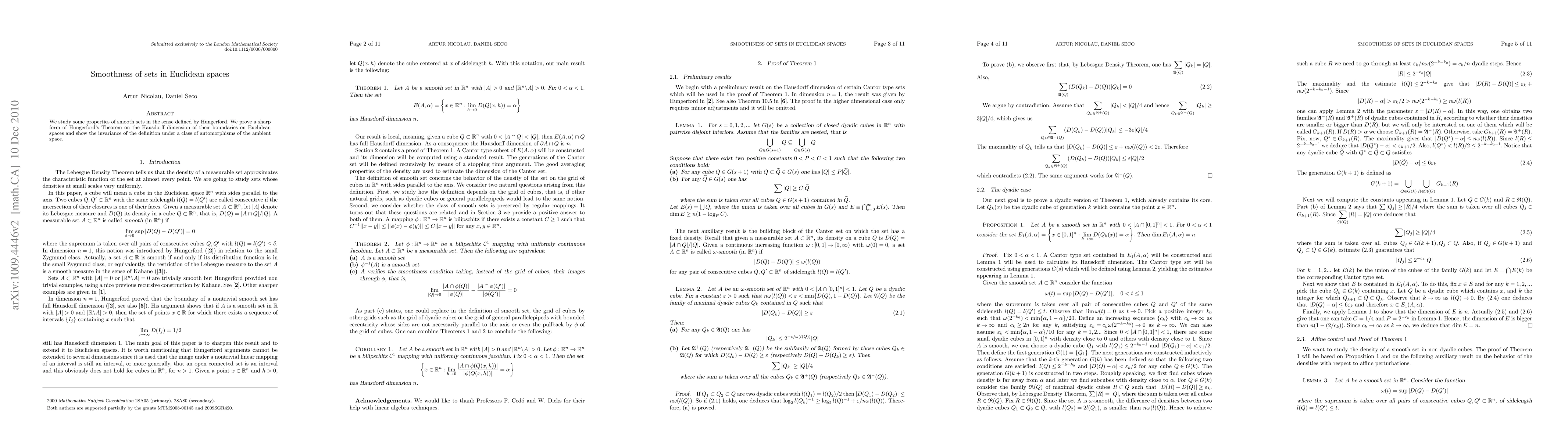 This paper investigates the properties of smooth sets in Euclidean spaces, proving a refined version of Hungerford's Theorem regarding the Hausdorff dimension of their boundaries and demonstrating the invariance of this definition under specific automorphisms of the space.