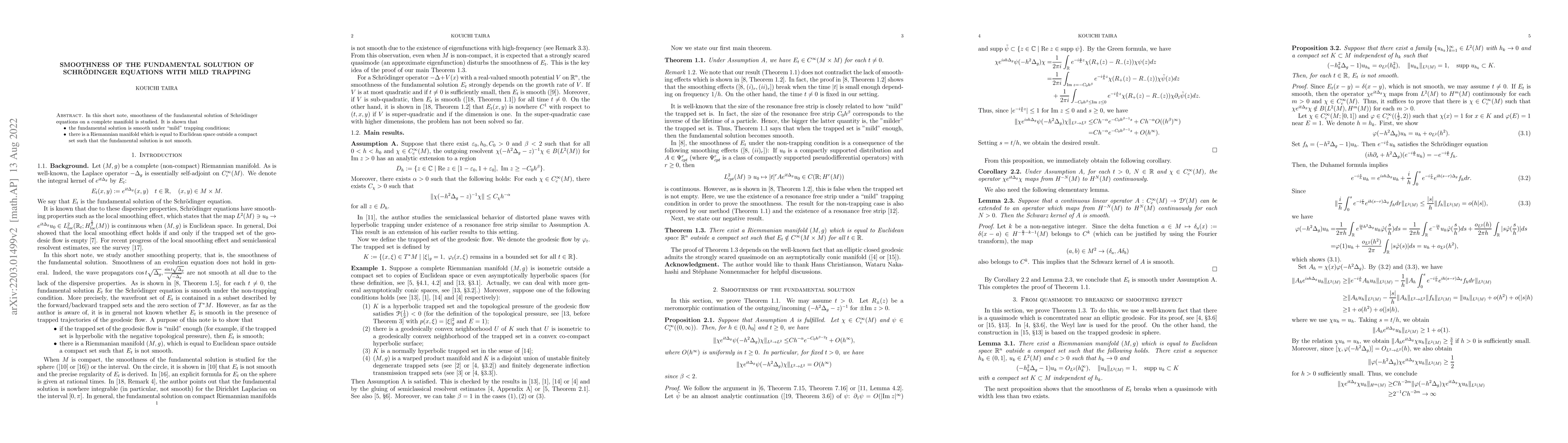 In this short note, smoothness of the fundamental solution of Schr\"odinger equations on a complete manifold is studied. It is shown that (1) the fundamental solution is smooth under "mild" trapping conditions; (2) there is a Riemannian manifold which is equal to Euclidean space outside a compact set such that the fundamental solution is not smooth.
