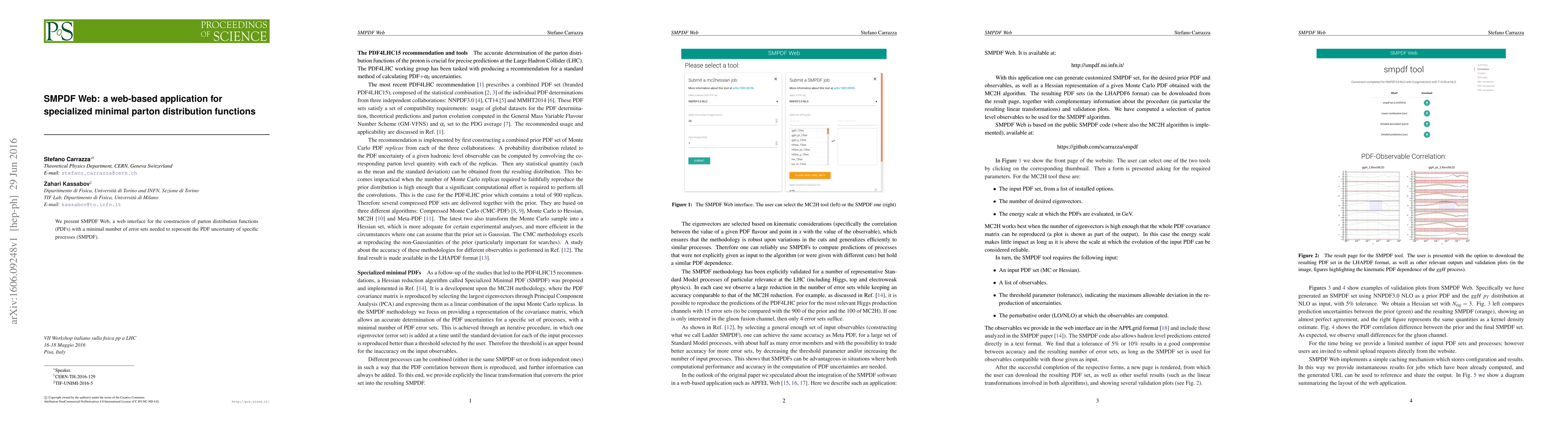 Summary: SMPDF Web is a web-based tool designed to construct specialized minimal parton distribution functions (SMPDF) with reduced error sets, enhancing the representation of uncertainties for specific processes. This application simplifies the process of generating PDFs with minimal uncertainty.
