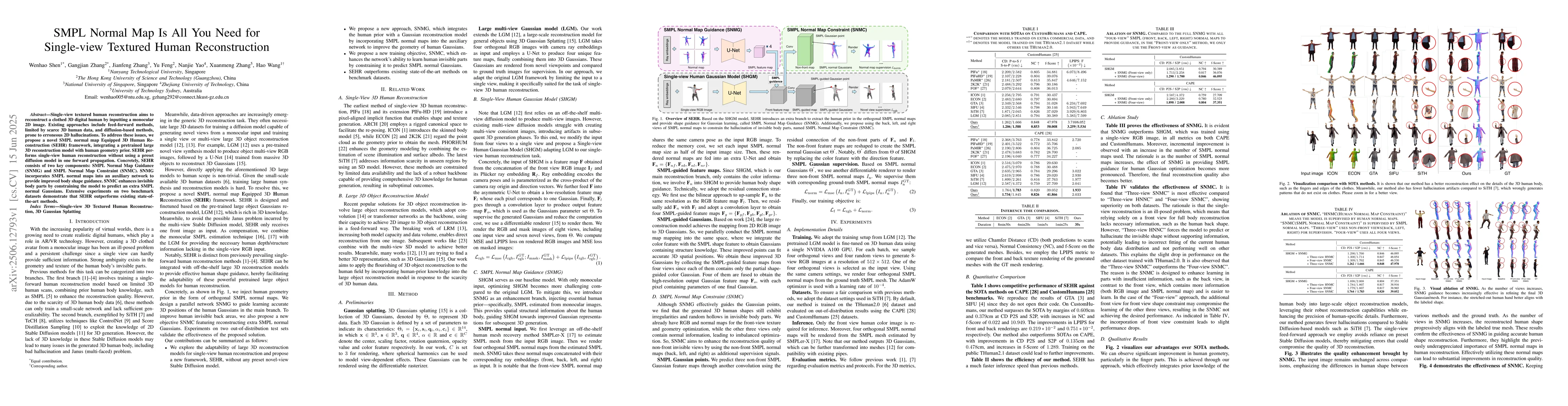 Single-view textured human reconstruction aims to reconstruct a clothed 3D digital human by inputting a monocular 2D image. Existing approaches include feed-forward methods, limited by scarce 3D human data, and diffusion-based methods, prone to erroneous 2D hallucinations. To address these issues, we propose a novel SMPL normal map Equipped 3D Human Reconstruction (SEHR) framework, integrating a pretrained large 3D reconstruction model with human geometry prior. SEHR performs single-view human reconstruction without using a preset diffusion model in one forward propagation. Concretely, SEHR consists of two key components: SMPL Normal Map Guidance (SNMG) and SMPL Normal Map Constraint (SNMC). SNMG incorporates SMPL normal maps into an auxiliary network to provide improved body shape guidance. SNMC enhances invisible body parts by constraining the model to predict an extra SMPL normal Gaussians. Extensive experiments on two benchmark datasets demonstrate that SEHR outperforms existing state-of-the-art methods.