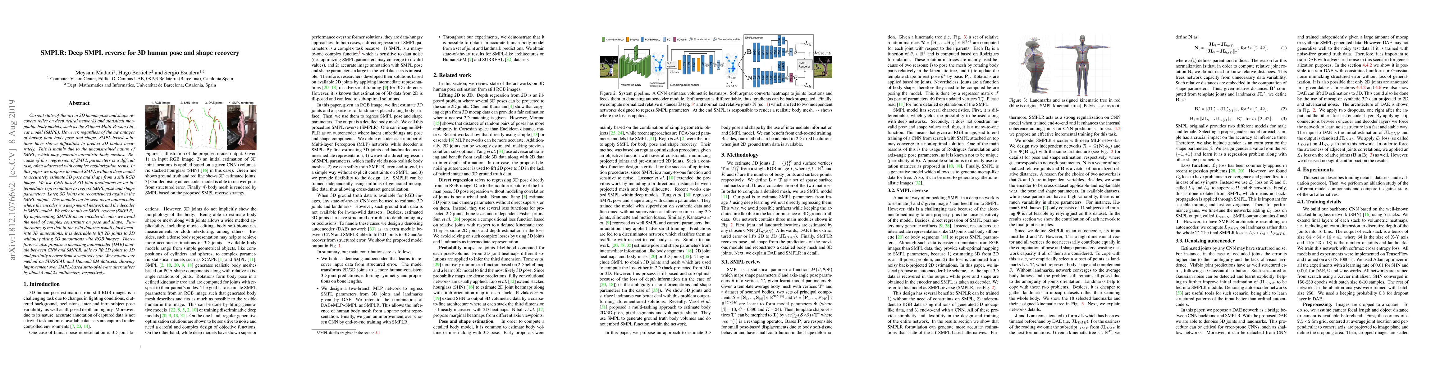 Current state-of-the-art in 3D human pose and shape recovery relies on deep neural networks and statistical morphable body models, such as the Skinned Multi-Person Linear model (SMPL). However, regardless of the advantages of having both body pose and shape, SMPL-based solutions have shown difficulties to predict 3D bodies accurately. This is mainly due to the unconstrained nature of SMPL, which may generate unrealistic body meshes. Because of this, regression of SMPL parameters is a difficult task, often addressed with complex regularization terms. In this paper we propose to embed SMPL within a deep model to accurately estimate 3D pose and shape from a still RGB image. We use CNN-based 3D joint predictions as an intermediate representation to regress SMPL pose and shape parameters. Later, 3D joints are reconstructed again in the SMPL output. This module can be seen as an autoencoder where the encoder is a deep neural network and the decoder is SMPL model. We refer to this as SMPL reverse (SMPLR). By implementing SMPLR as an encoder-decoder we avoid the need of complex constraints on pose and shape. Furthermore, given that in-the-wild datasets usually lack accurate 3D annotations, it is desirable to lift 2D joints to 3D without pairing 3D annotations with RGB images. Therefore, we also propose a denoising autoencoder (DAE) module between CNN and SMPLR, able to lift 2D joints to 3D and partially recover from structured error. We evaluate our method on SURREAL and Human3.6M datasets, showing improvement over SMPL-based state-of-the-art alternatives by about 4 and 25 millimeters, respectively.