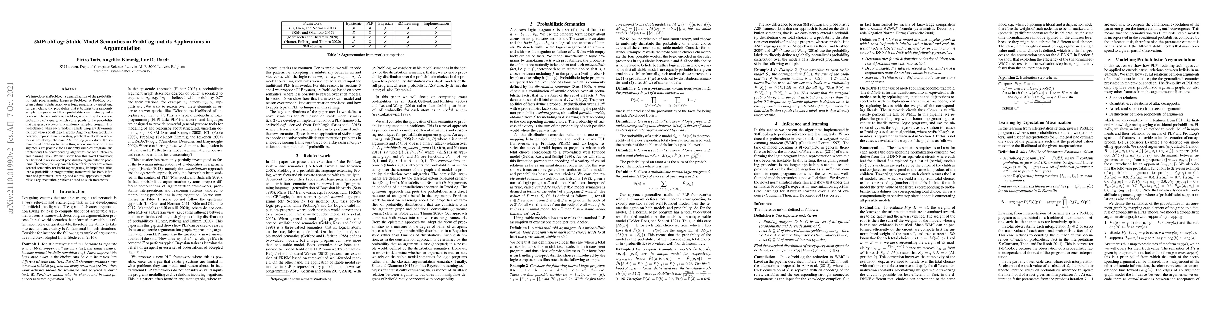 This paper introduces SMProbLog, a generalization of ProbLog that extends its semantics to handle multiple truth assignments in argumentation problems. It implements algorithms for inference and learning within this new framework and demonstrates its application to probabilistic argumentation.
