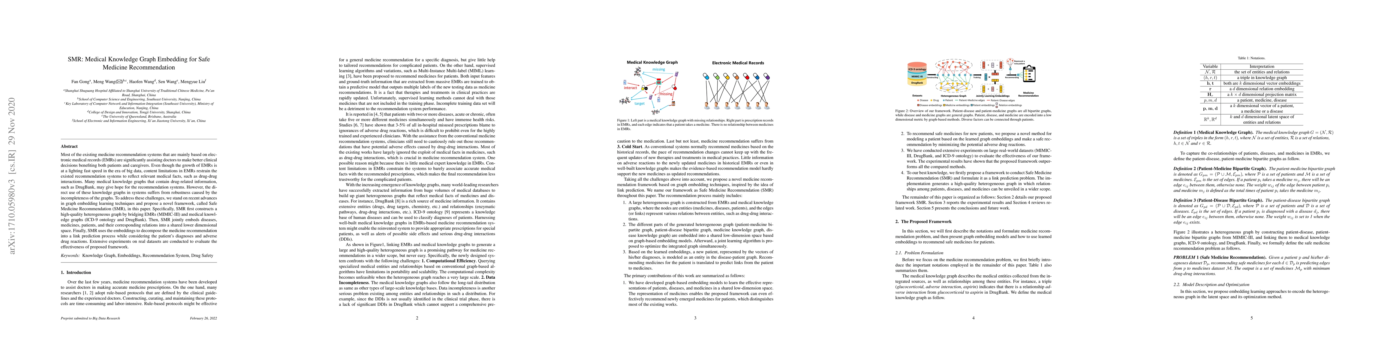 This paper proposes a novel framework, Safe Medicine Recommendation (SMR), to enhance medicine recommendation systems by integrating electronic medical records and medical knowledge graphs. SMR constructs a high-quality heterogeneous graph and uses graph embedding techniques to embed diseases, medicines, and patients into a shared space, enabling safe and effective medicine recommendations while considering patient-specific factors.
