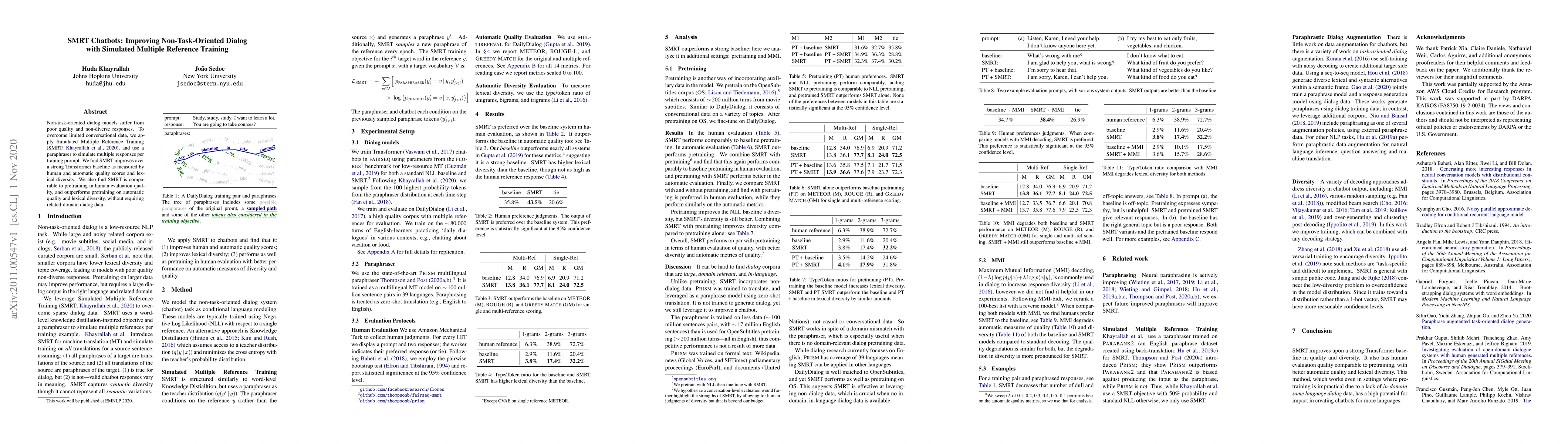 This paper proposes Simulated Multiple Reference Training (SMRT) to enhance non-task-oriented chatbots, improving response quality and diversity. SMRT uses a paraphraser to generate multiple training responses, outperforming a Transformer baseline and achieving comparable human evaluation quality to pretraining, while excelling in automatic metrics and lexical diversity.