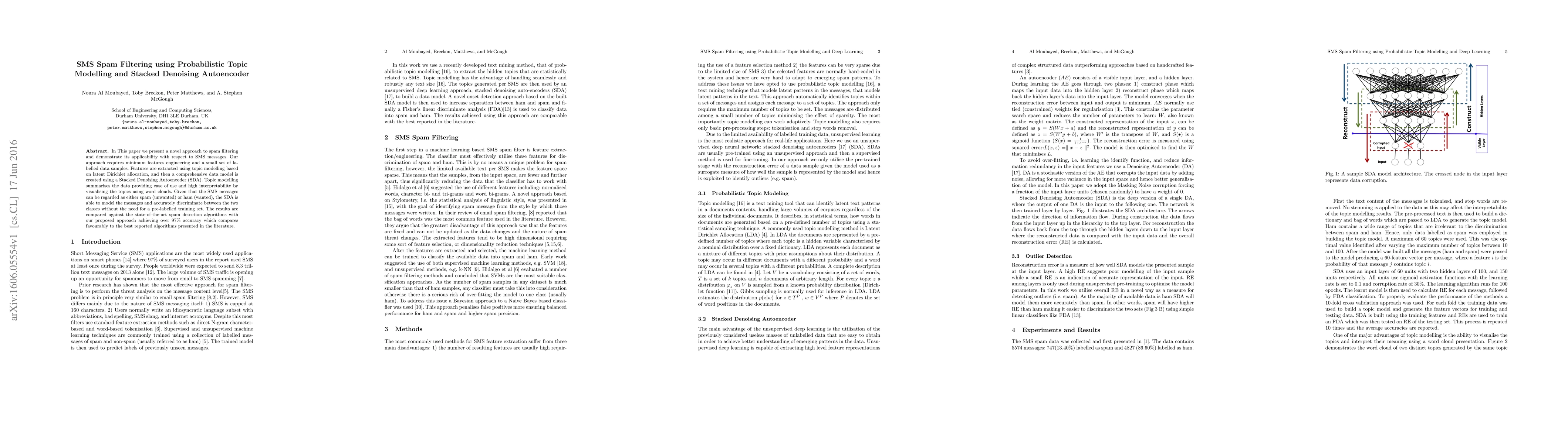 This paper proposes a novel SMS spam filtering method using probabilistic topic modelling and a Stacked Denoising Autoencoder, achieving over 97% accuracy. The approach minimizes feature engineering and leverages latent Dirichlet allocation for topic modelling and SDA for classification.