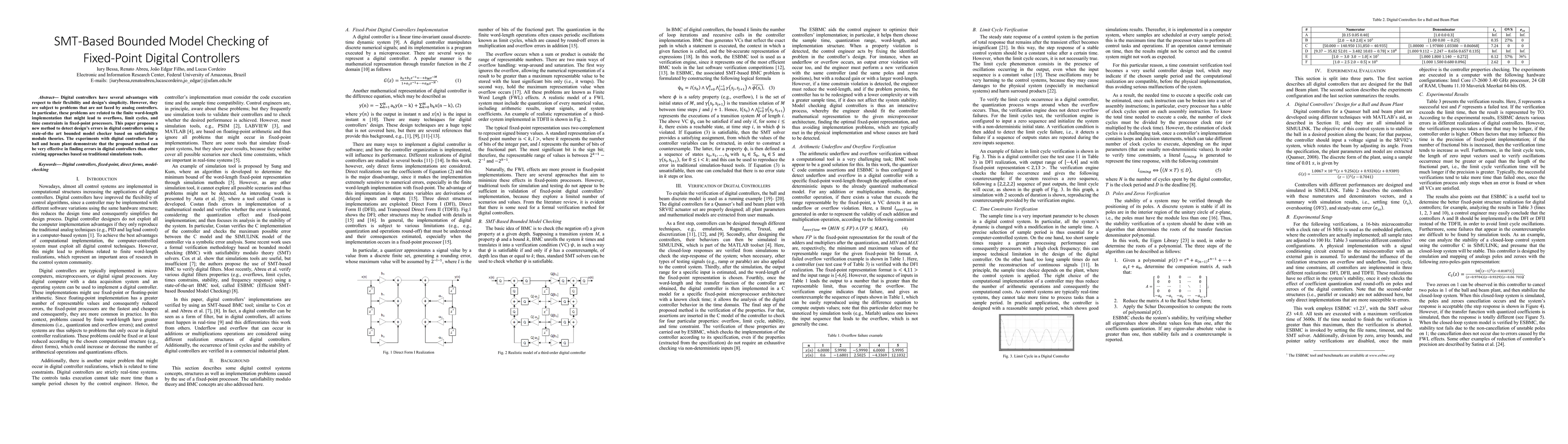 Digital controllers have several advantages with respect to their flexibility and design's simplicity. However, they are subject to problems that are not faced by analog controllers. In particular, these problems are related to the finite word-length implementation that might lead to overflows, limit cycles, and time constraints in fixed-point processors. This paper proposes a new method to detect design's errors in digital controllers using a state-of-the art bounded model checker based on satisfiability modulo theories. The experiments with digital controllers for a ball and beam plant demonstrate that the proposed method can be very effective in finding errors in digital controllers than other existing approaches based on traditional simulations tools.