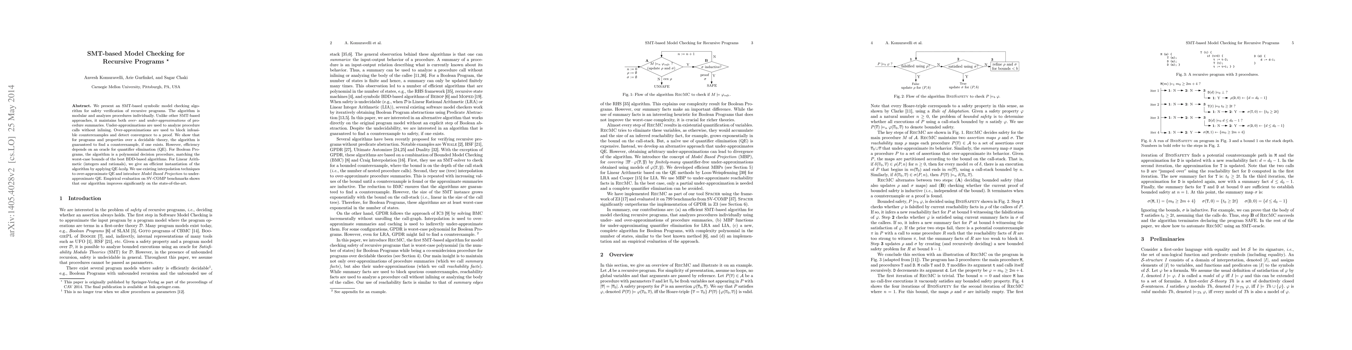 This paper introduces an SMT-based symbolic model checking algorithm for verifying recursive programs, employing both over- and under-approximations to improve analysis efficiency. The method outperforms existing BDD-based algorithms and shows significant improvements on SV-COMP benchmarks.