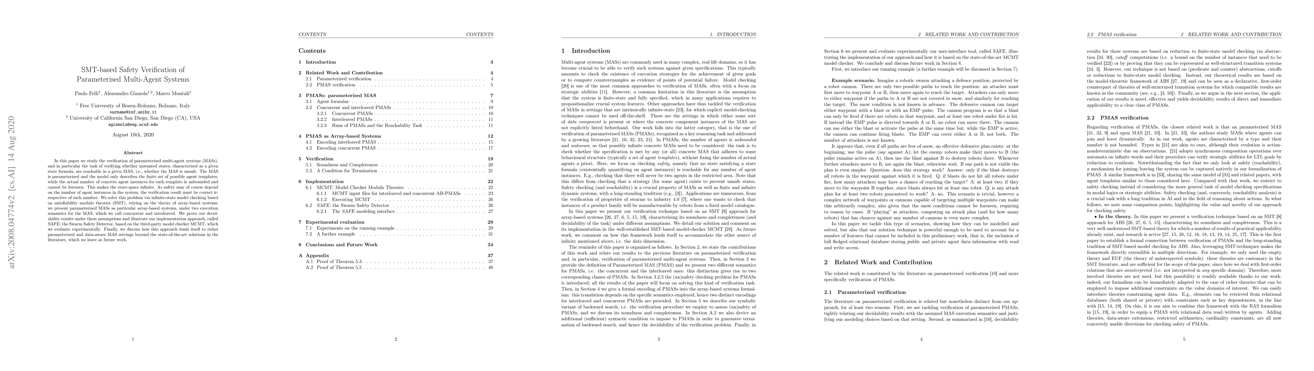 In this paper we study the verification of parameterised multi-agent systems (MASs), and in particular the task of verifying whether unwanted states, characterised as a given state formula, are reachable in a given MAS, i.e., whether the MAS is unsafe. The MAS is parameterised and the model only describes the finite set of possible agent templates, while the actual number of concrete agent instances for each template is unbounded and cannot be foreseen. This makes the state-space infinite. As safety may of course depend on the number of agent instances in the system, the verification result must be correct irrespective of such number. We solve this problem via infinite-state model checking based on satisfiability modulo theories (SMT), relying on the theory of array-based systems: we present parameterised MASs as particular array-based systems, under two execution semantics for the MAS, which we call concurrent and interleaved. We prove our decidability results under these assumptions and illustrate our implementation approach, called SAFE: the Swarm Safety Detector, based on the third-party model checker MCMT, which we evaluate experimentally. Finally, we discuss how this approach lends itself to richer parameterised and data-aware MAS settings beyond the state-of-the-art solutions in the literature, which we leave as future work.