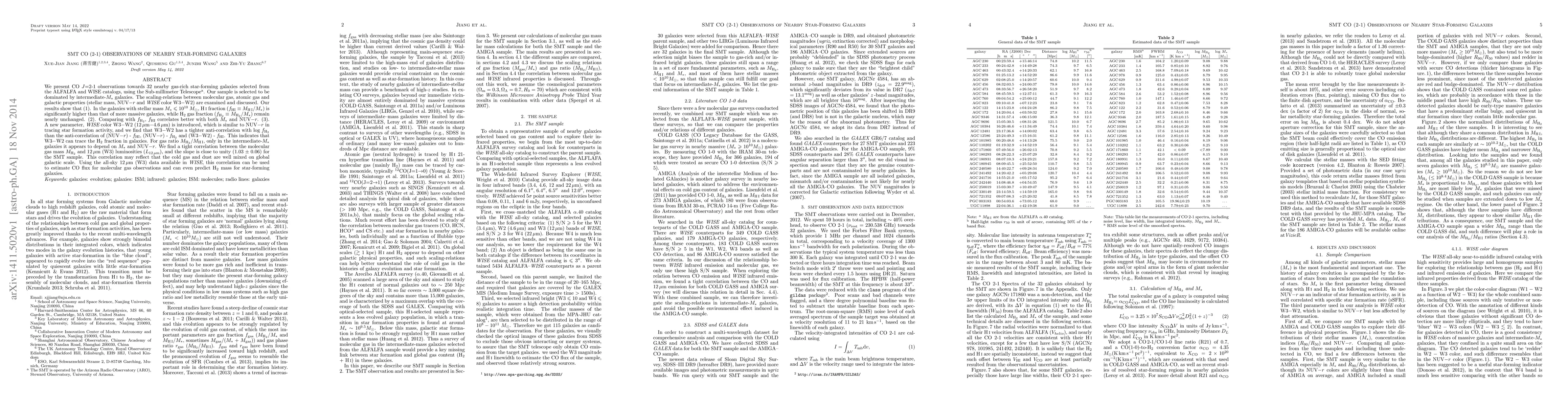 This study observes CO J=2-1 emissions from 32 nearby star-forming galaxies, revealing correlations between molecular gas, atomic gas, and galactic properties, as well as a new parameter, WISE color W3-W2, that can trace H2 fraction in galaxies.