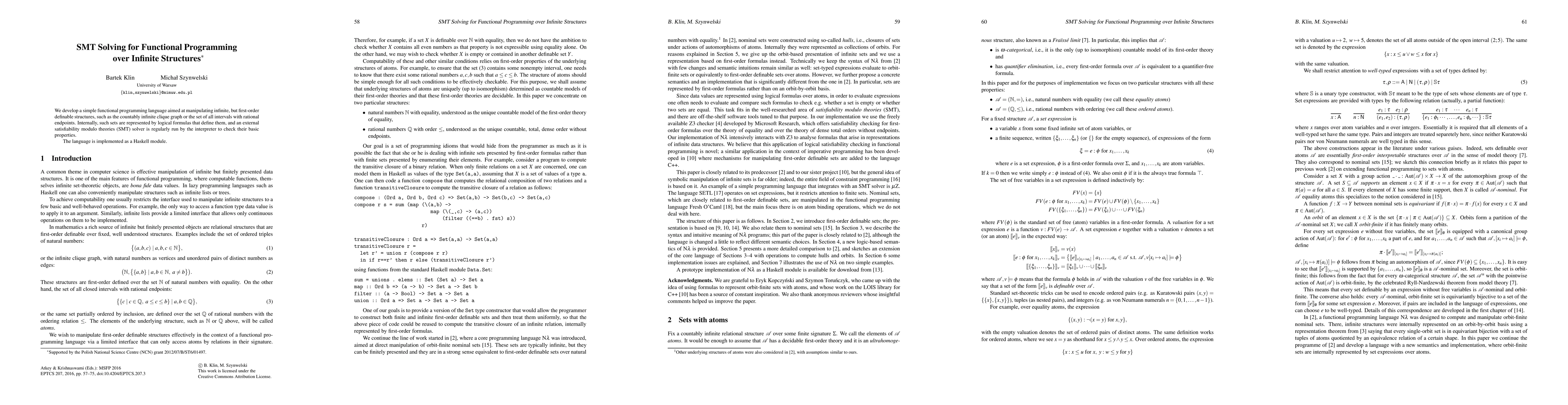 We develop a simple functional programming language aimed at manipulating infinite, but first-order definable structures, such as the countably infinite clique graph or the set of all intervals with rational endpoints. Internally, such sets are represented by logical formulas that define them, and an external satisfiability modulo theories (SMT) solver is regularly run by the interpreter to check their basic properties. The language is implemented as a Haskell module.