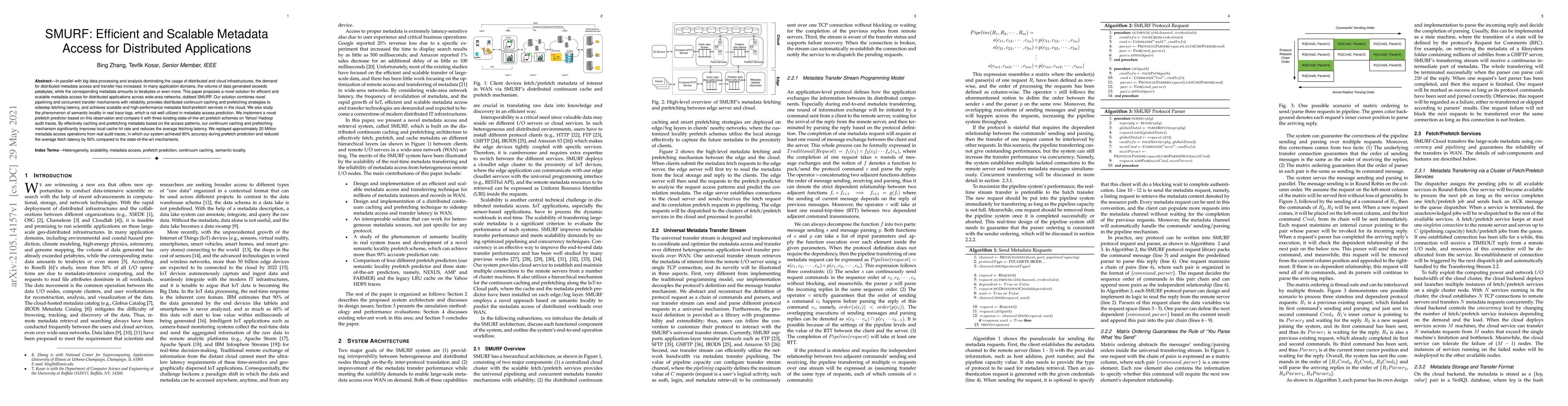 SMURF is a novel solution for efficient and scalable metadata access in distributed applications, combining pipelining, concurrent transfer, and distributed caching to reduce latency. It significantly improves local cache hit rates and reduces average fetch latency by 50% compared to existing methods, achieving 90% accuracy in prefetch prediction based on real trace logs.