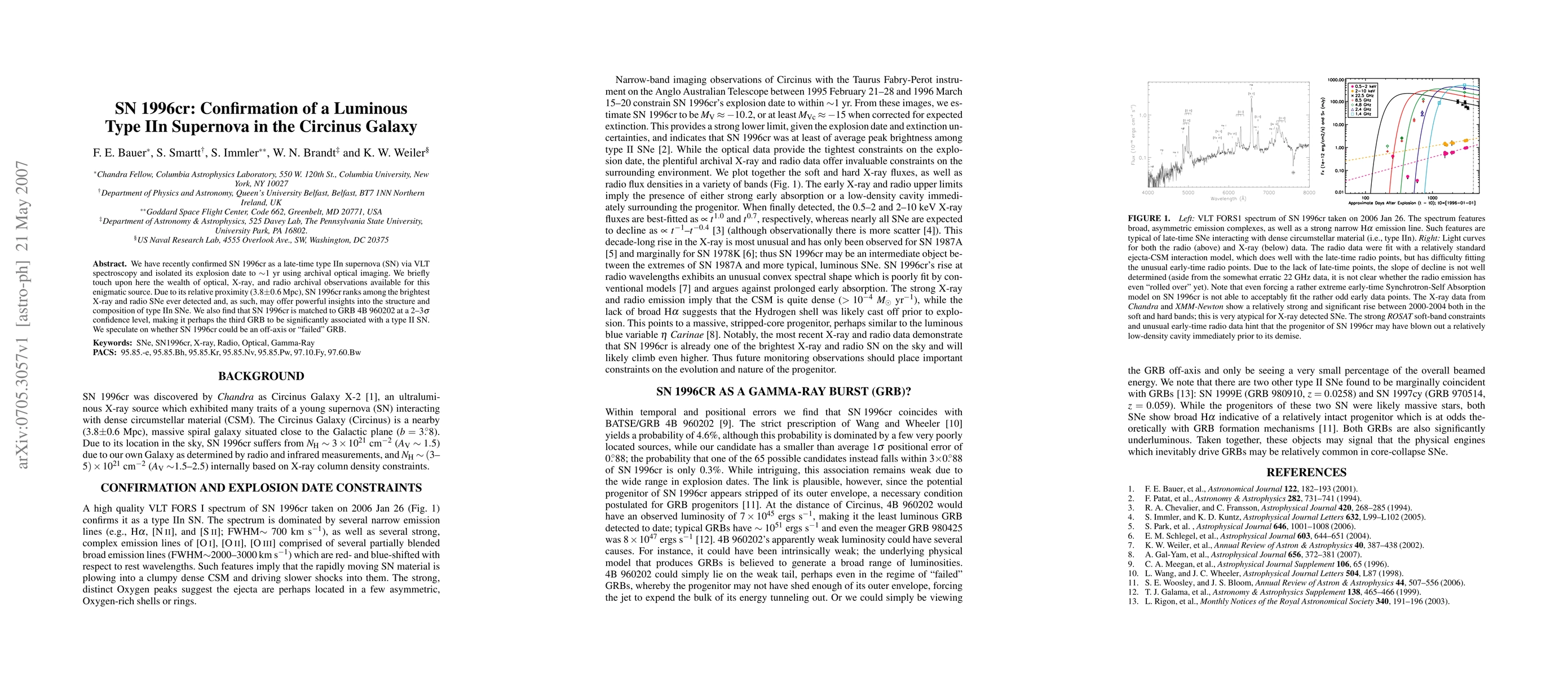 We have recently confirmed SN 1996cr as a late-time type IIn supernova (SN) via VLT spectroscopy and isolated its explosion date to ~1 yr using archival optical imaging. We briefly touch upon here the wealth of optical, X-ray, and radio archival observations available for this enigmatic source. Due to its relative proximity (3.8 +/-0.6 Mpc), SN 1996cr ranks among the brightest X-ray and radio SNe ever detected and, as such, may offer powerful insights into the structure and composition of type IIn SNe. We also find that SN 1996cr is matched to GRB 4B 960202 at a 2-3 sigma confidence level, making it perhaps the third GRB to be significantly associated with a type II SN. We speculate on whether SN 1996cr could be an off-axis or ``failed'' GRB.