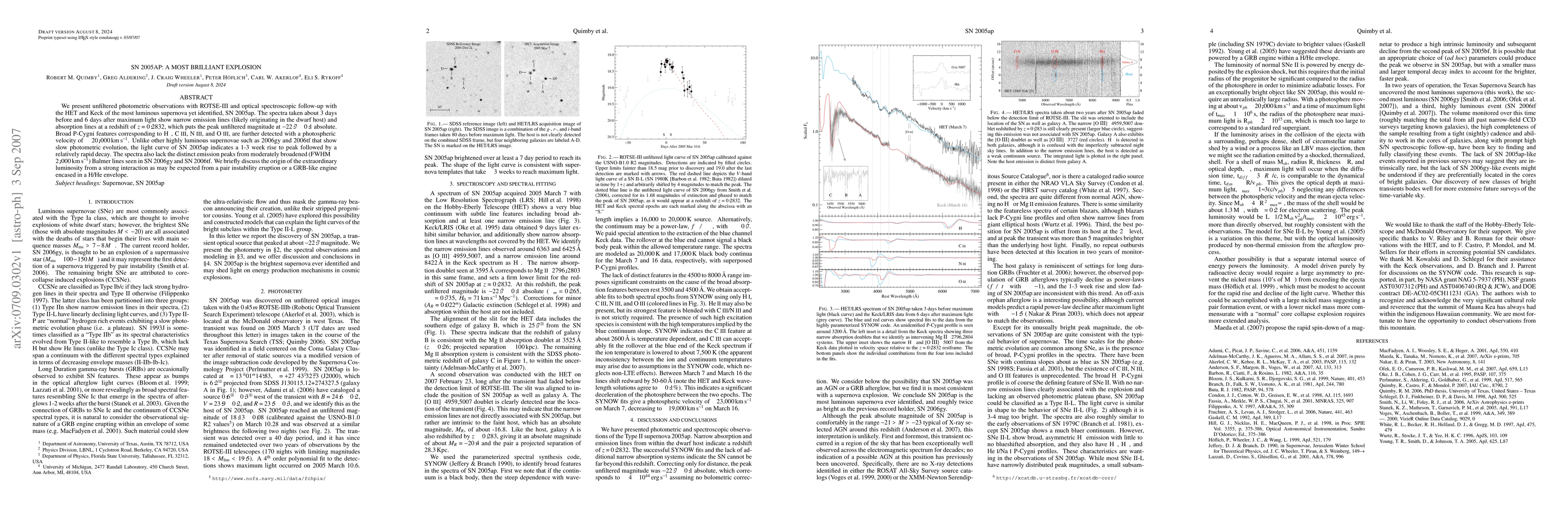We present unfiltered photometric observations with ROTSE-III and optical spectroscopic follow-up with the HET and Keck of the most luminous supernova yet identified, SN 2005ap. The spectra taken about 3 days before and 6 days after maximum light show narrow emission lines (likely originating in the dwarf host) and absorption lines at a redshift of z=0.2832, which puts the peak unfiltered magnitude at -22.7 +/- 0.1 absolute. Broad P-Cygni features corresponding to H-alpha, CIII, NIII, and OIII, are further detected with a photospheric velocity of ~20,000 km/s. Unlike other highly luminous supernovae such as 2006gy and 2006tf that show slow photometric evolution, the light curve of SN 2005ap indicates a 1-3 week rise to peak followed by a relatively rapid decay. The spectra also lack the distinct emission peaks from moderately broadened (FWHM ~ 2,000 km/s) Balmer lines seen in SN 2006gy and SN 2006tf. We briefly discuss the origin of the extraordinary luminosity from a strong interaction as may be expected from a pair instability eruption or a GRB-like engine encased in a H/He envelope.
