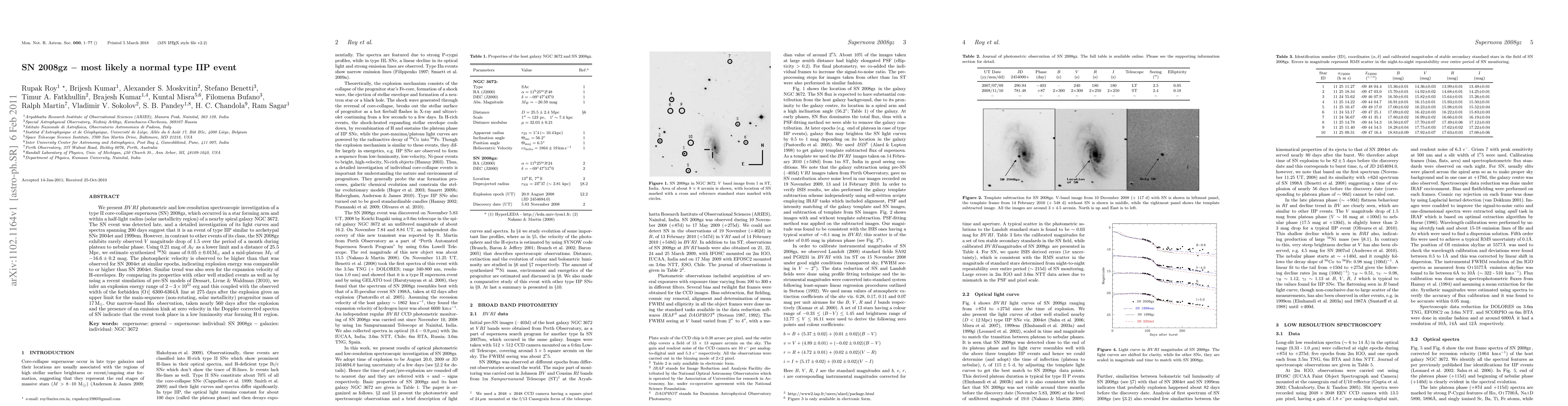 We present BV RI photometric and low-resolution spectroscopic investigation of a type II core-collapse supernova (SN) 2008gz, which occurred in a star forming arm and within a half-light radius (solar metallicity region) of a nearby spiral galaxy NGC 3672. The SN event was detected late and a detailed investigation of its light curves and spectra spanning 200 days suggest that it is an event of type IIP similar to archetypal SNe 2004et and 1999em. However, in contrast to other events of its class, the SN 2008gz exhibits rarely observed V magnitude drop of 1.5 over the period of a month during plateau to nebular phase. Using 0.21 mag of Av as a lower limit and a distance of 25.5 Mpc, we estimate synthesized $^{56}$Ni mass of 0.05 \pm 0.01 M* and a mid-plateau Mv of -16.6 \pm 0.2 mag. The photospheric velocity is observed to be higher than that was observed for SN 2004et at similar epochs, indicating explosion energy was comparable to or higher than SN 2004et. Similar trend was also seen for the expansion velocity of H-envelopes. By comparing its properties with other well studied events as well as by using a recent simulation of pre-SN models of Dessart, Livne & Waldman (2010), we infer an explosion energy range of 2 - 3 x 10$^{51}$ erg and this coupled with the observed width of the forbidden [O I] 6300-6364 {\AA} line at 275 days after the explosion gives an upper limit for the main-sequence (non-rotating, solar metallicity) progenitor mass of 17 M*. Our narrow-band H{\alpha} observation, taken nearly 560 days after the explosion and the presence of an emission kink at zero velocity in the Doppler corrected spectra of SN indicate that the event took place in a low luminosity star forming H II region.