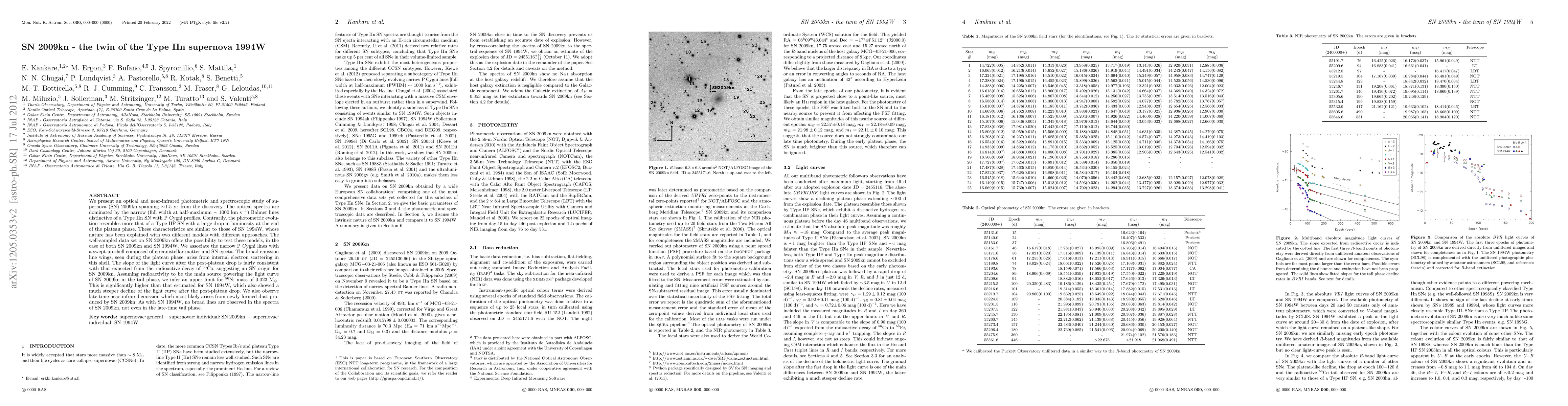 We present an optical and near-infrared photometric and spectroscopic study of supernova (SN) 2009kn spanning ~1.5 yr from the discovery. The optical spectra are dominated by the narrow (full width at half-maximum ~1000 km s^-1) Balmer lines distinctive of a Type IIn SN with P Cygni profiles. Contrarily, the photometric evolution resembles more that of a Type IIP SN with a large drop in luminosity at the end of the plateau phase. These characteristics are similar to those of SN 1994W, whose nature has been explained with two different models with different approaches. The well-sampled data set on SN 2009kn offers the possibility to test these models, in the case of both SN 2009kn and SN 1994W. We associate the narrow P Cygni lines with a swept-up shell composed of circumstellar matter and SN ejecta. The broad emission line wings, seen during the plateau phase, arise from internal electron scattering in this shell. The slope of the light curve after the post-plateau drop is fairly consistent with that expected from the radioactive decay of 56Co, suggesting an SN origin for SN 2009kn. Assuming radioactivity to be the main source powering the light curve of SN 2009kn in the tail phase, we infer an upper limit for 56Ni mass of 0.023 M_sun. This is significantly higher than that estimated for SN 1994W, which also showed a much steeper decline of the light curve after the post-plateau drop. We also observe late-time near-infrared emission which most likely arises from newly formed dust produced by SN 2009kn. As with SN 1994W, no broad lines are observed in the spectra of SN 2009kn, not even in the late-time tail phase.