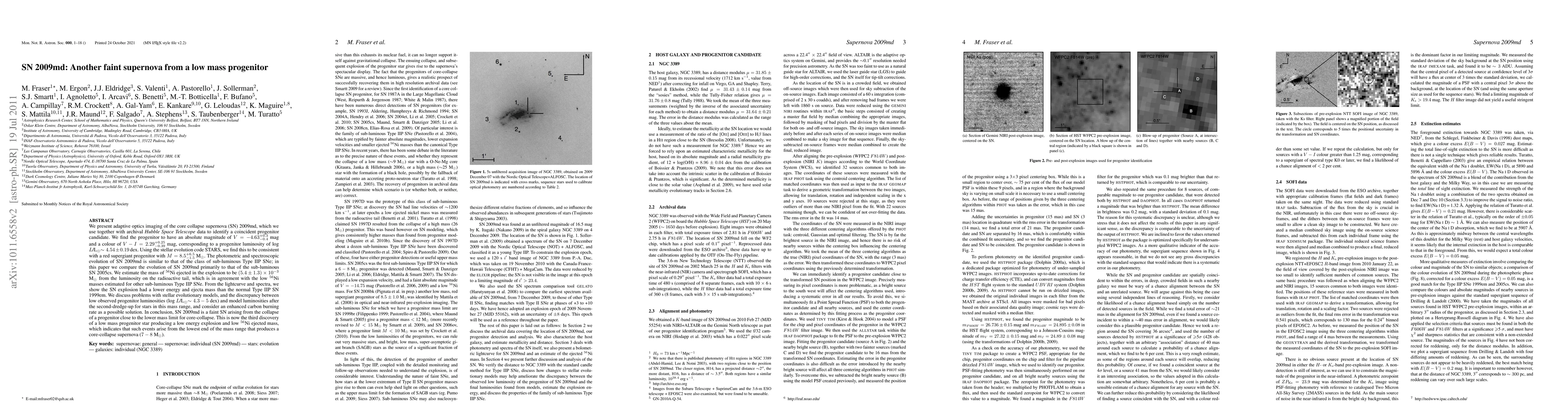 SN 2009md is identified as a faint supernova from a low mass red supergiant progenitor, with an estimated mass of 8.5 M$_{\odot}$. The supernova exhibits sub-luminous Type IIP characteristics, with a low ejected mass of $^{56}$Ni and lower energy compared to typical supernovae.
