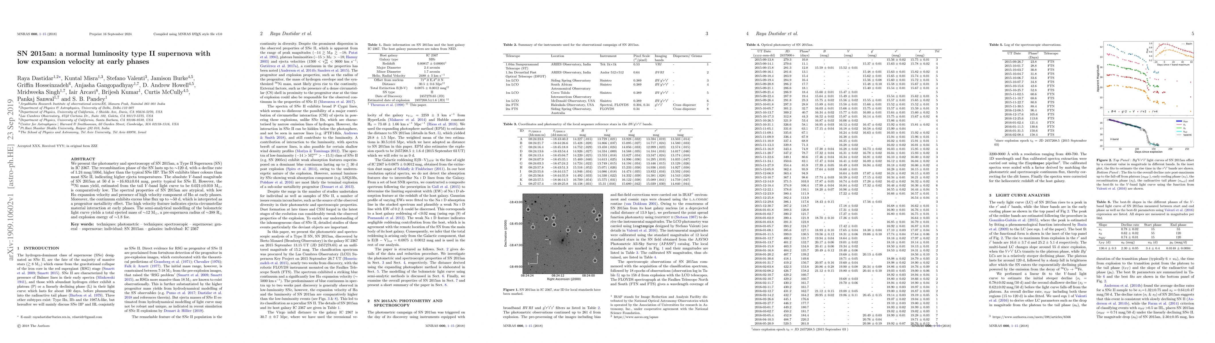 We present the photometry and spectroscopy of SN 2015an, a Type II Supernova (SN) in IC 2367. The recombination phase of the SN lasts up to $\sim$120 d, with a decline rate of 1.24 mag/100d, higher than the typical SNe IIP. The SN exhibits bluer colours than most SNe II, indicating higher ejecta temperatures. The absolute $V$-band magnitude of SN 2015an at 50 d is $-$16.83$\pm$0.04 mag, pretty typical for SNe II. However, the $^{56}$Ni mass yield, estimated from the tail $V$-band light curve to be 0.021$\pm$0.010 M$_\odot$, is comparatively low. The spectral properties of SN 2015an are atypical, with low H$\alpha$ expansion velocity and presence of high velocity component of H$\alpha$ at early phases. Moreover, the continuum exhibits excess blue flux up to $\sim$50 d, which is interpreted as a progenitor metallicity effect. The high velocity feature indicates ejecta-circumstellar material interaction at early phases. The semi-analytical modelling of the bolometric light curve yields a total ejected mass of $\sim$12 M$_\odot$, a pre-supernova radius of $\sim$388~R$_\odot$ and explosion energy of $\sim$1.8 foe.